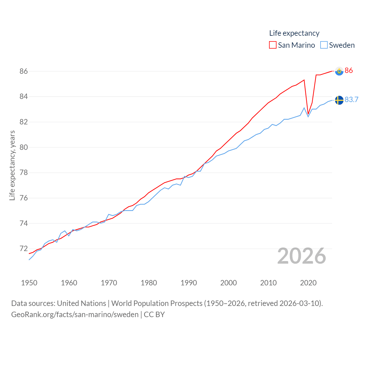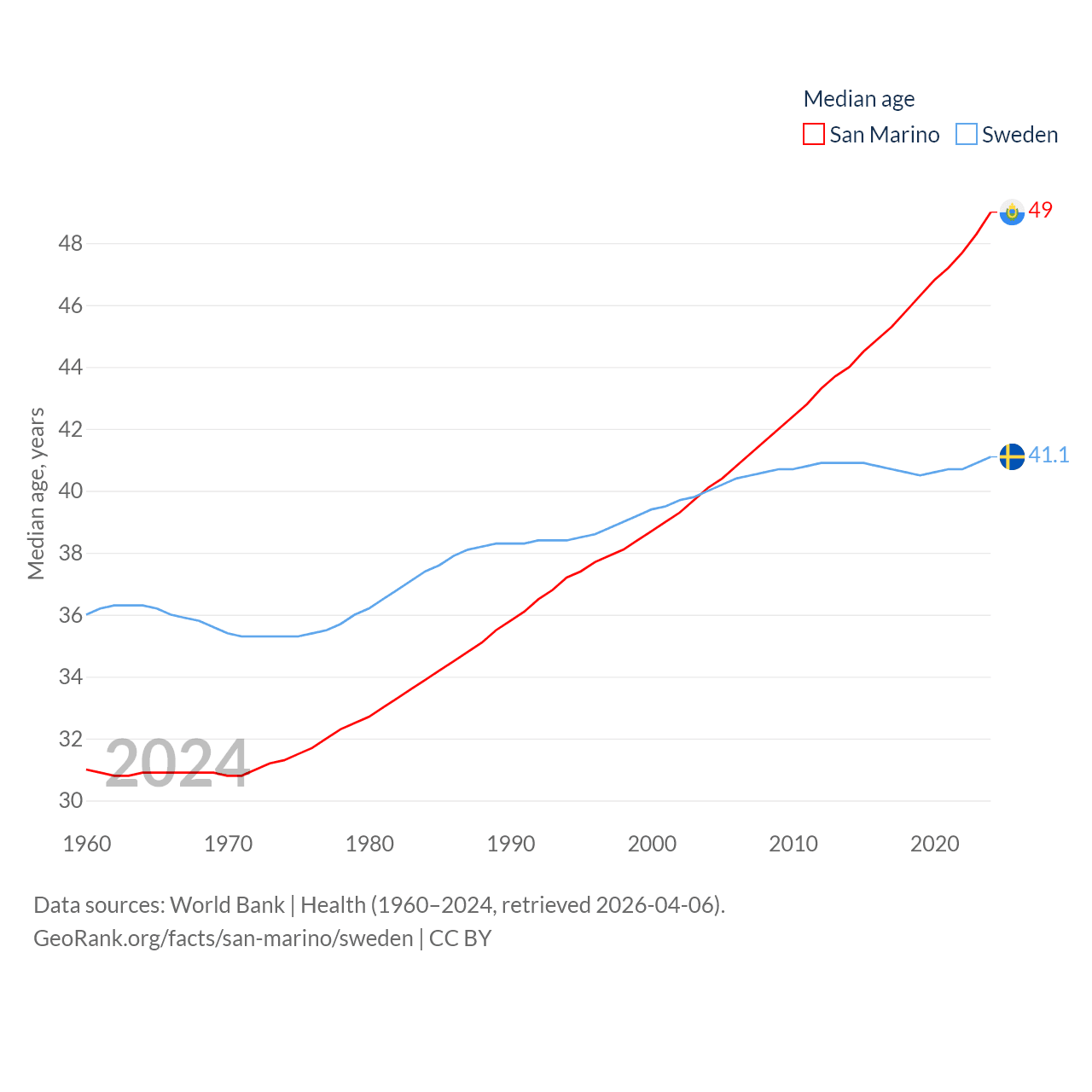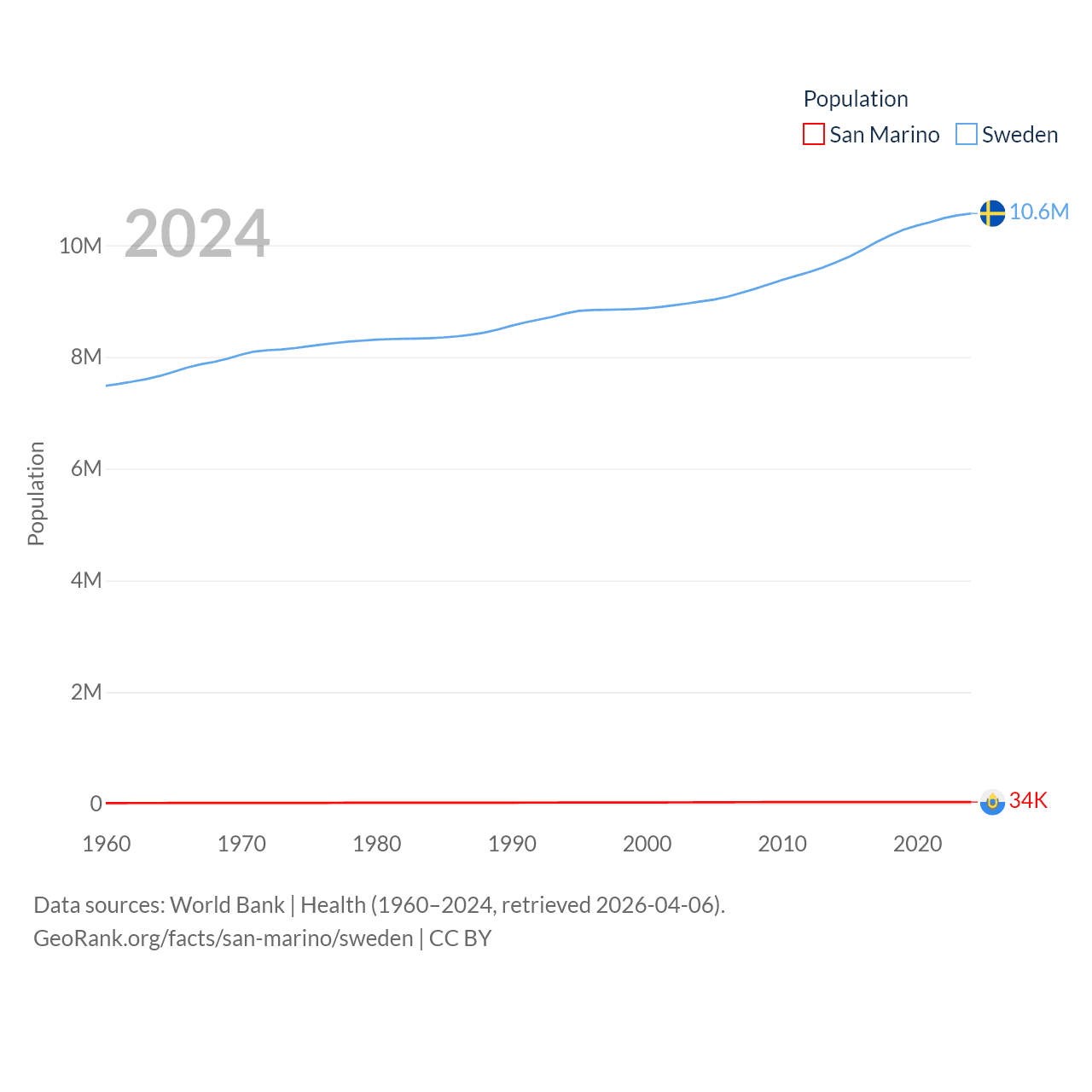 San Marino has a population of 34K (ranked 193/197), compared with 10.6M in Sweden (ranked 93/197). San Marino's land area is 23.2 sq mi versus 157,248 sq mi for Sweden (ranked 193rd vs. 58th).