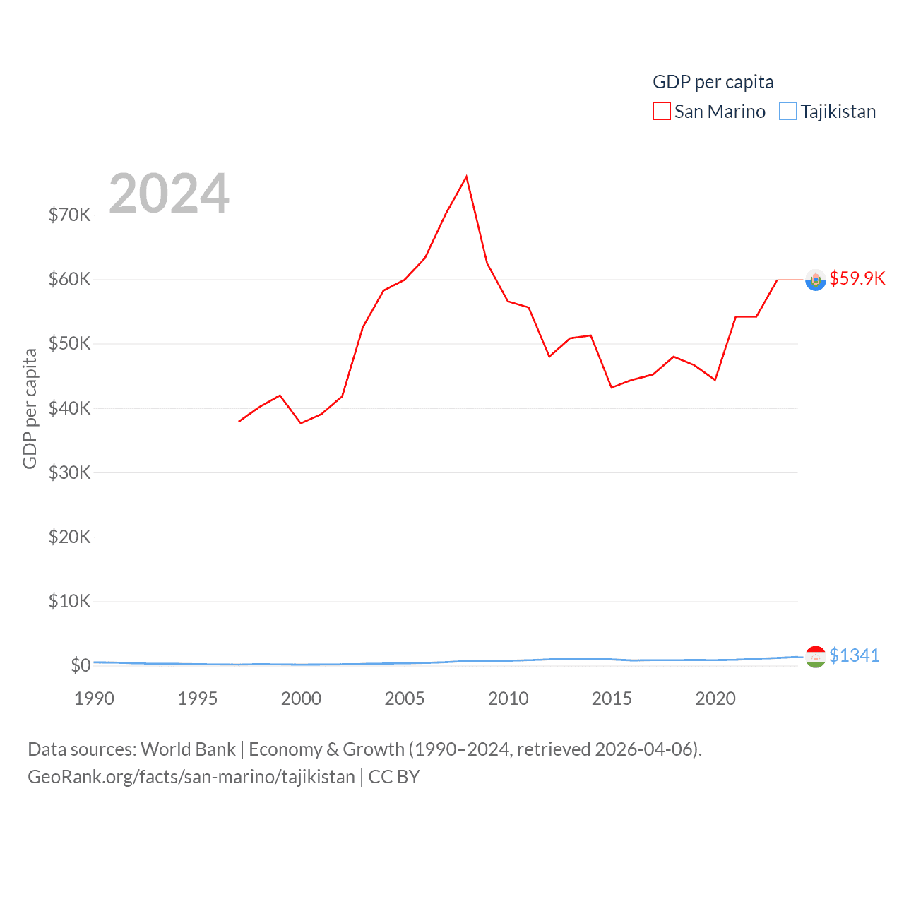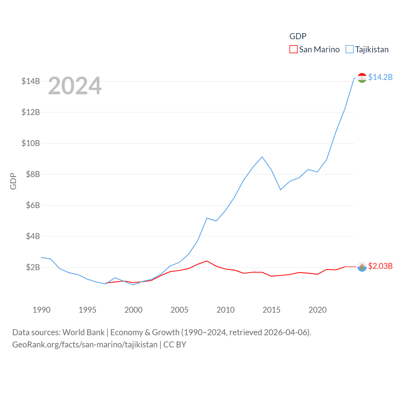 By GDP, San Marino ranks 180/197 ($2.03B) and Tajikistan ranks 145/197 ($14.2B). By GDP per capita, San Marino ranks 15/197 ($59,880), while Tajikistan ranks 166/197 ($1,341).