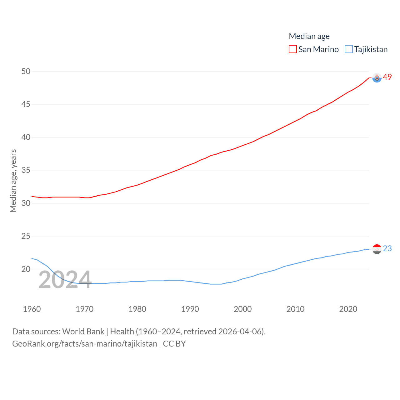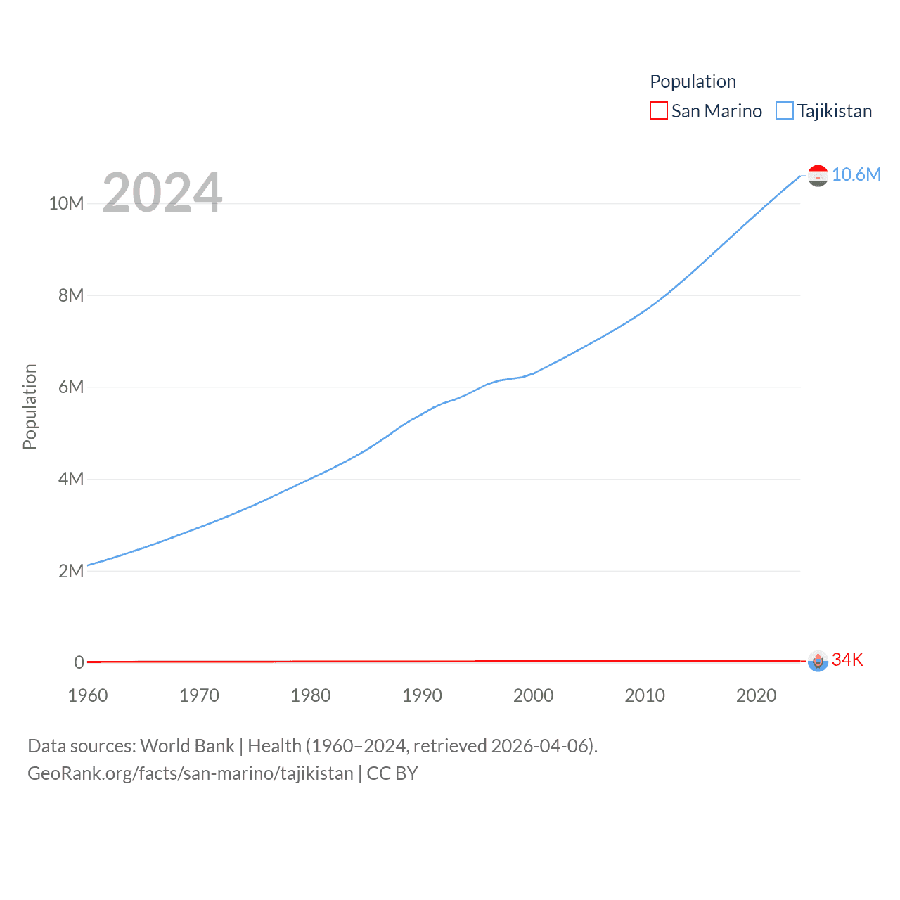 San Marino has a population of 34K (ranked 193/197), compared with 10.6M in Tajikistan (ranked 91/197). San Marino's land area is 23.2 sq mi versus 53,587 sq mi for Tajikistan (ranked 193rd vs. 93rd).