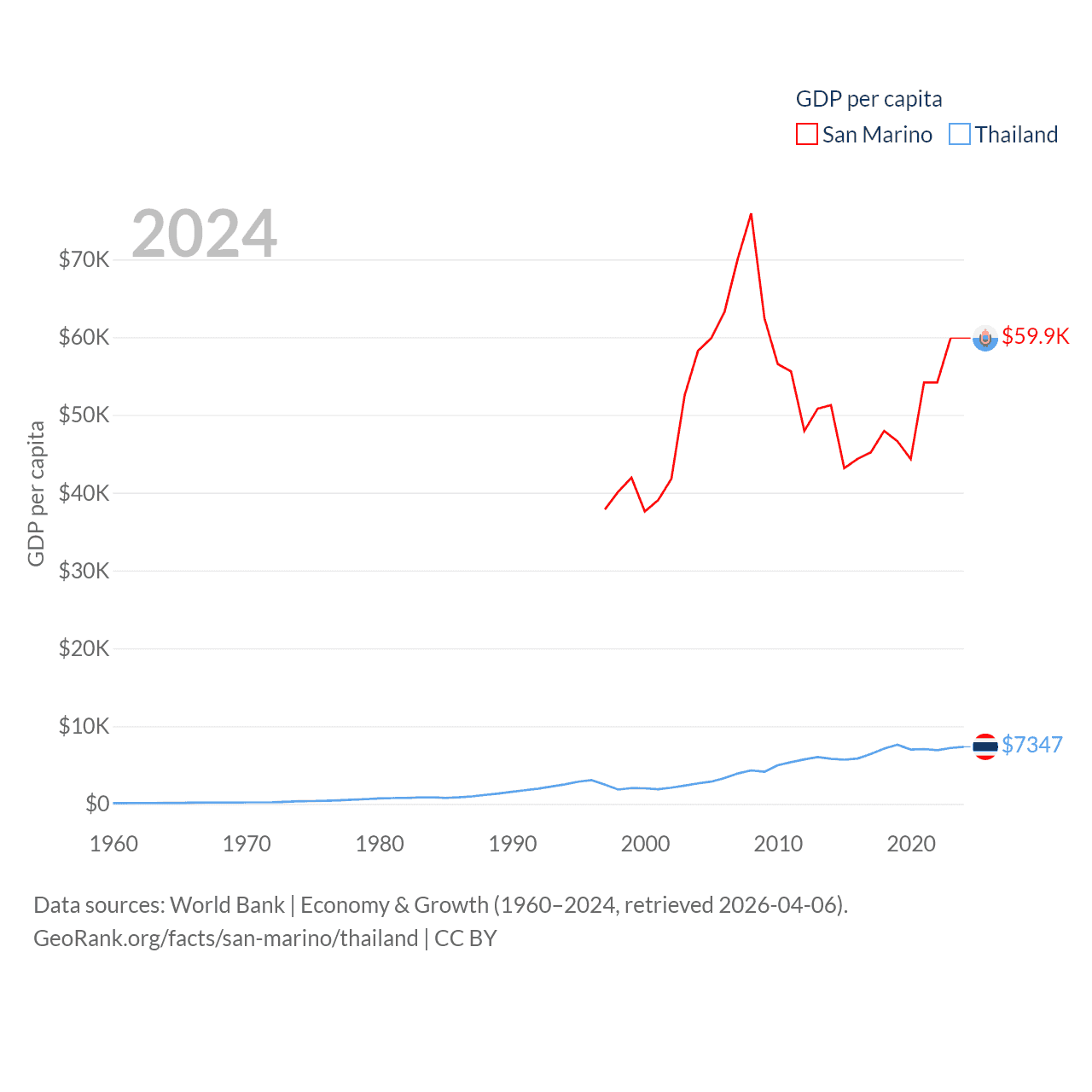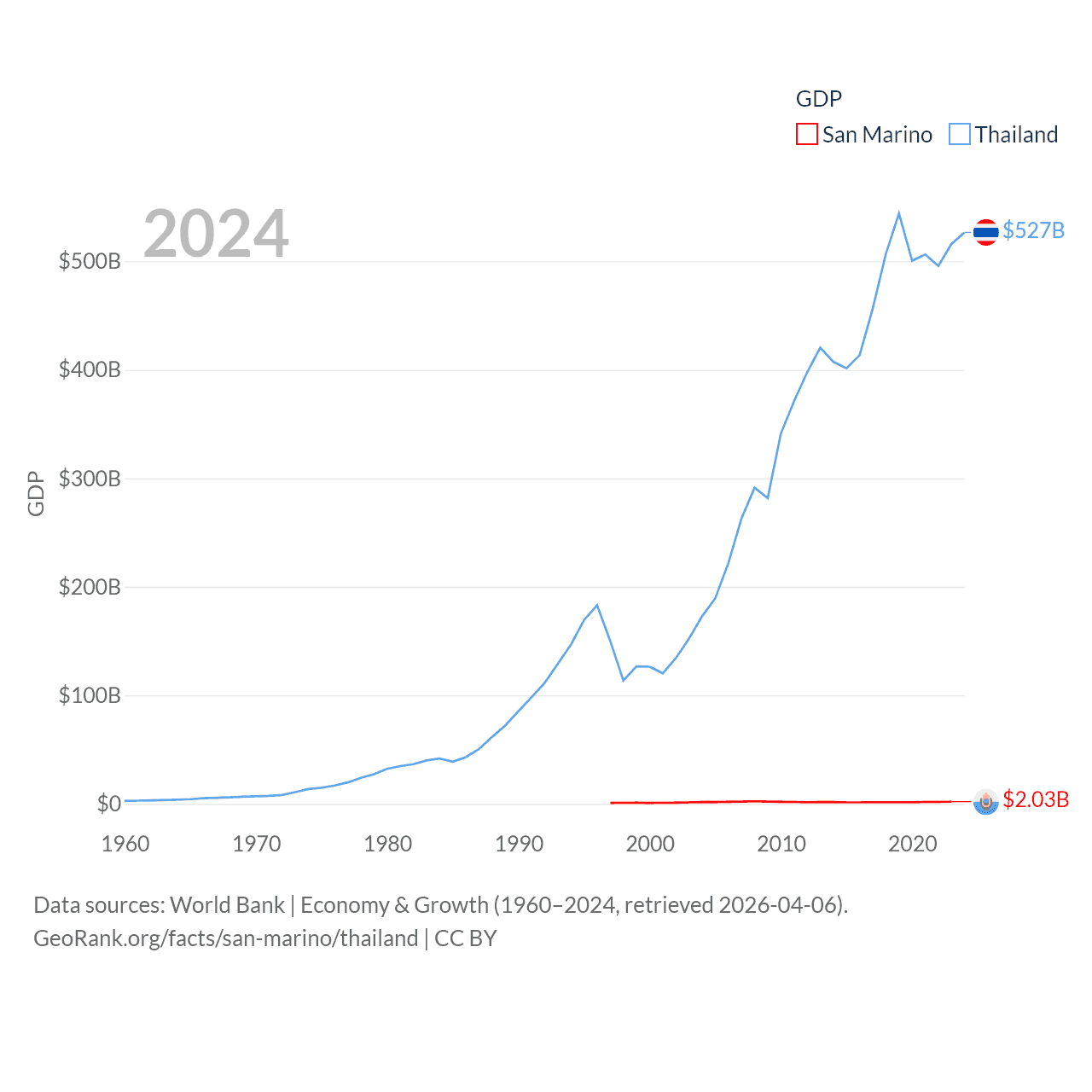 By GDP, San Marino ranks 180/197 ($2.03B) and Thailand ranks 31/197 ($527B). By GDP per capita, San Marino ranks 15/197 ($59,880), while Thailand ranks 100/197 ($7,347).