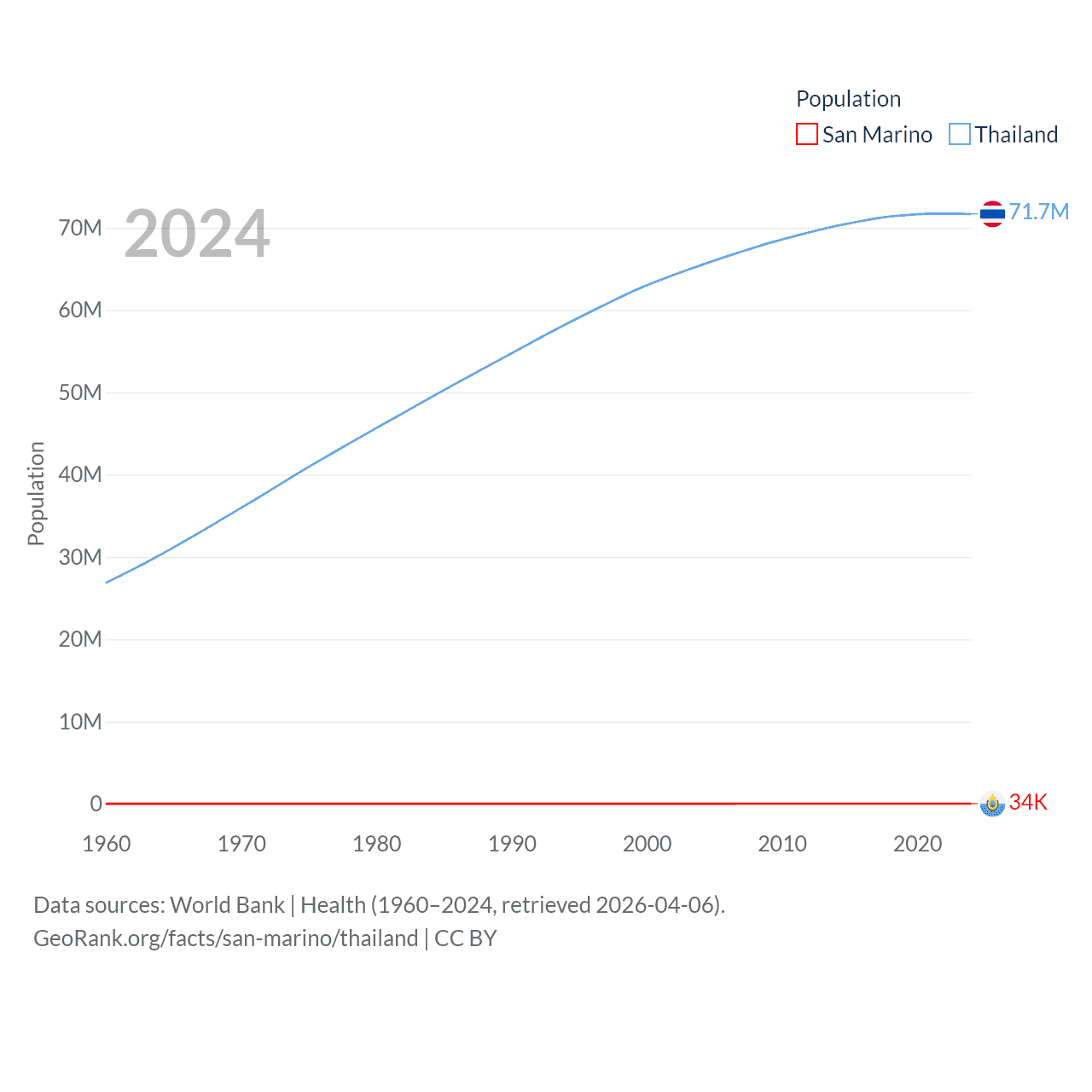 San Marino has a population of 34K (ranked 193/197), compared with 71.7M in Thailand (ranked 20/197). San Marino's land area is 23.2 sq mi versus 197,256 sq mi for Thailand (ranked 193rd vs. 50th).