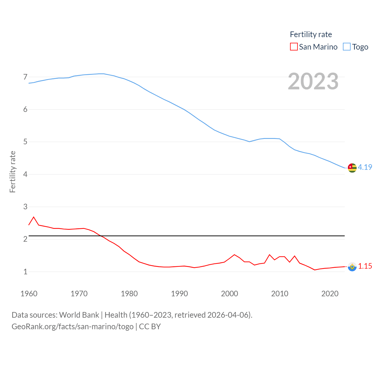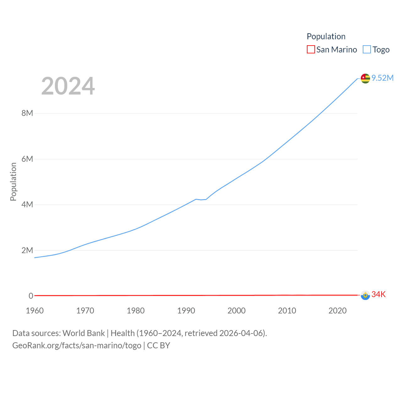 San Marino has a population of 34K (ranked 193/197), compared with 9.52M in Togo (ranked 98/197). San Marino's land area is 23.2 sq mi versus 21,000 sq mi for Togo (ranked 193rd vs. 124th).