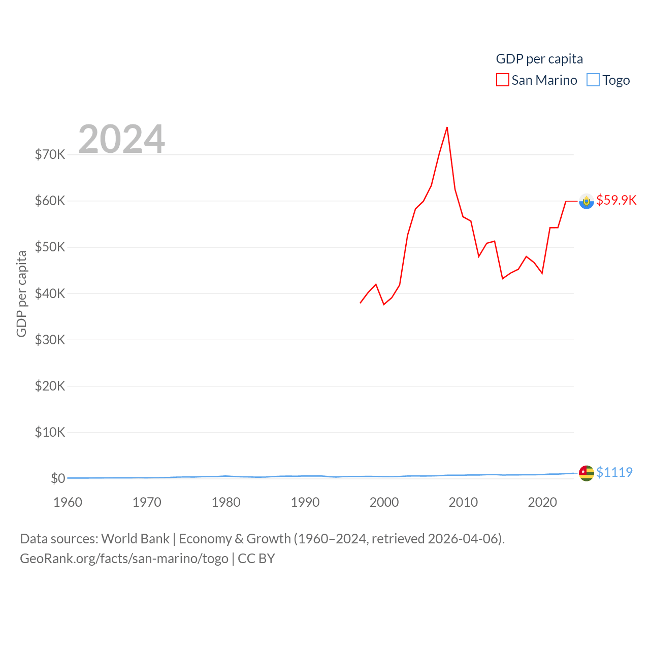 By GDP, San Marino ranks 180/197 ($2.03B) and Togo ranks 154/197 ($10.7B). By GDP per capita, San Marino ranks 15/197 ($59,880), while Togo ranks 172/197 ($1,119).