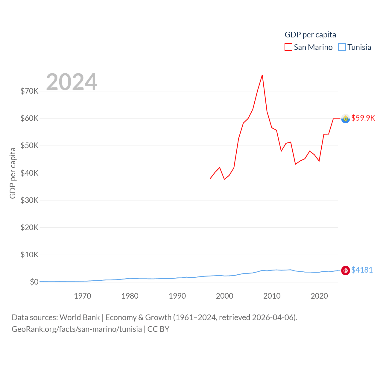 By GDP, San Marino ranks 180/197 ($2.03B) and Tunisia ranks 93/197 ($51.3B). By GDP per capita, San Marino ranks 15/197 ($59,880), while Tunisia ranks 129/197 ($4,181).