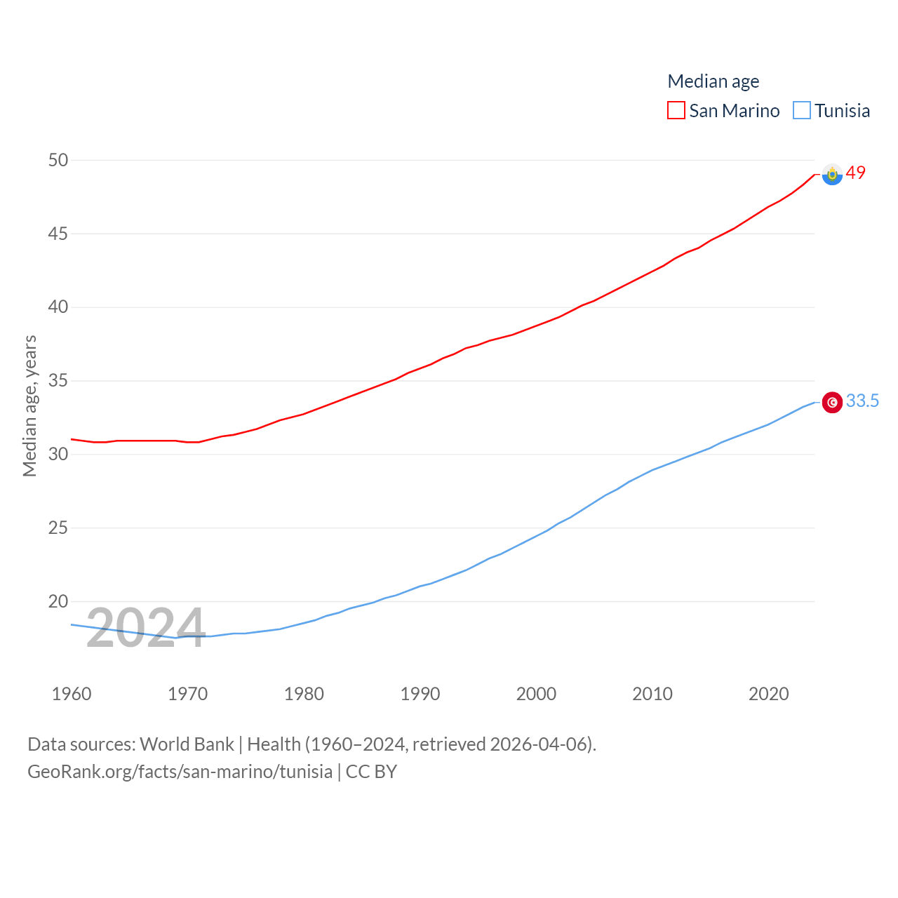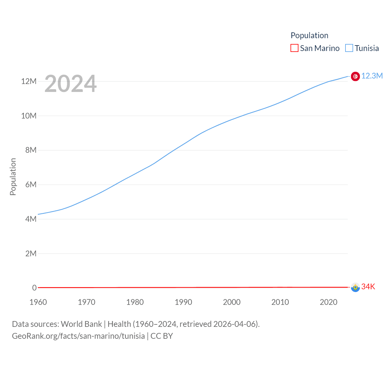 San Marino has a population of 34K (ranked 193/197), compared with 12.3M in Tunisia (ranked 80/197). San Marino's land area is 23.2 sq mi versus 59,985 sq mi for Tunisia (ranked 193rd vs. 91st).