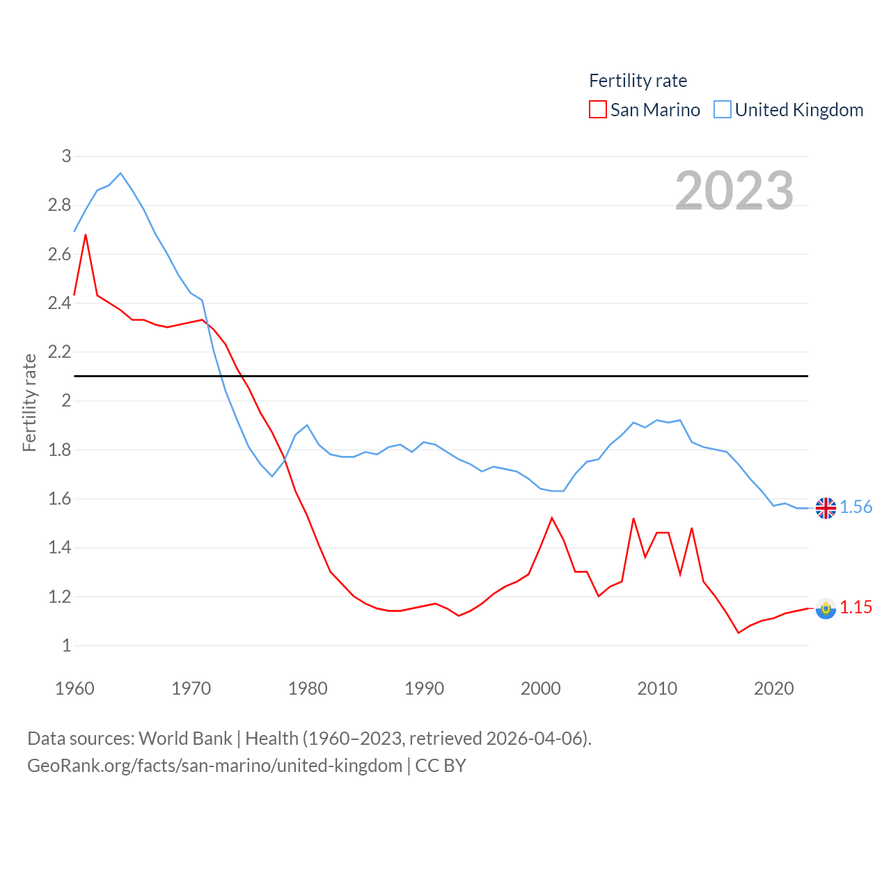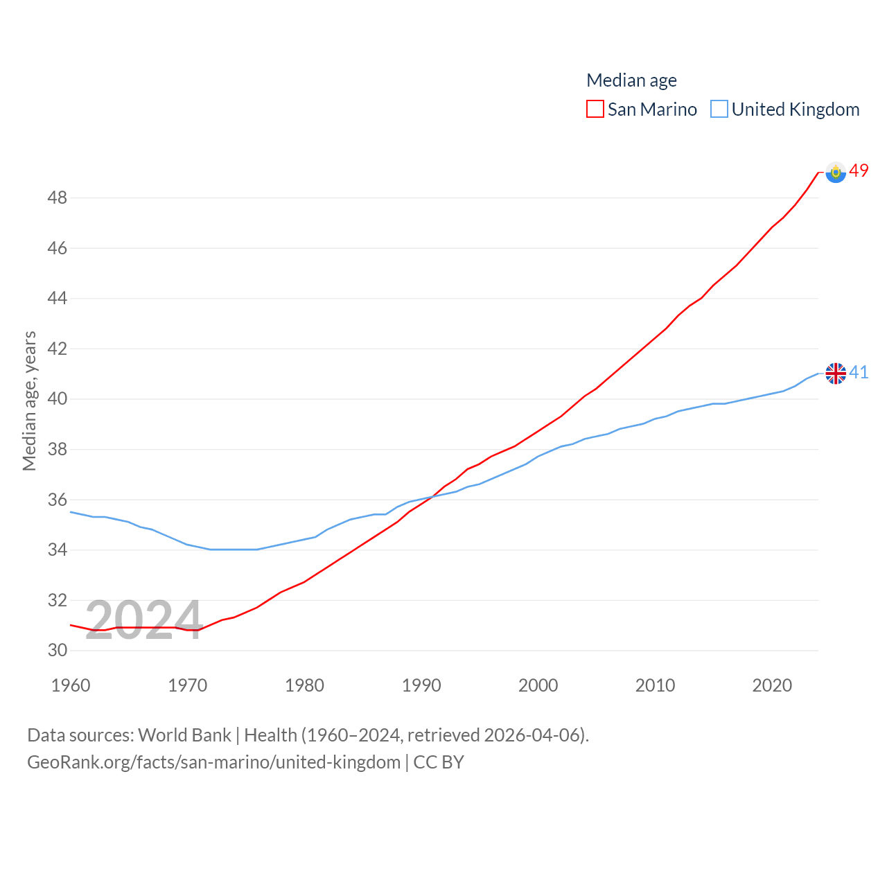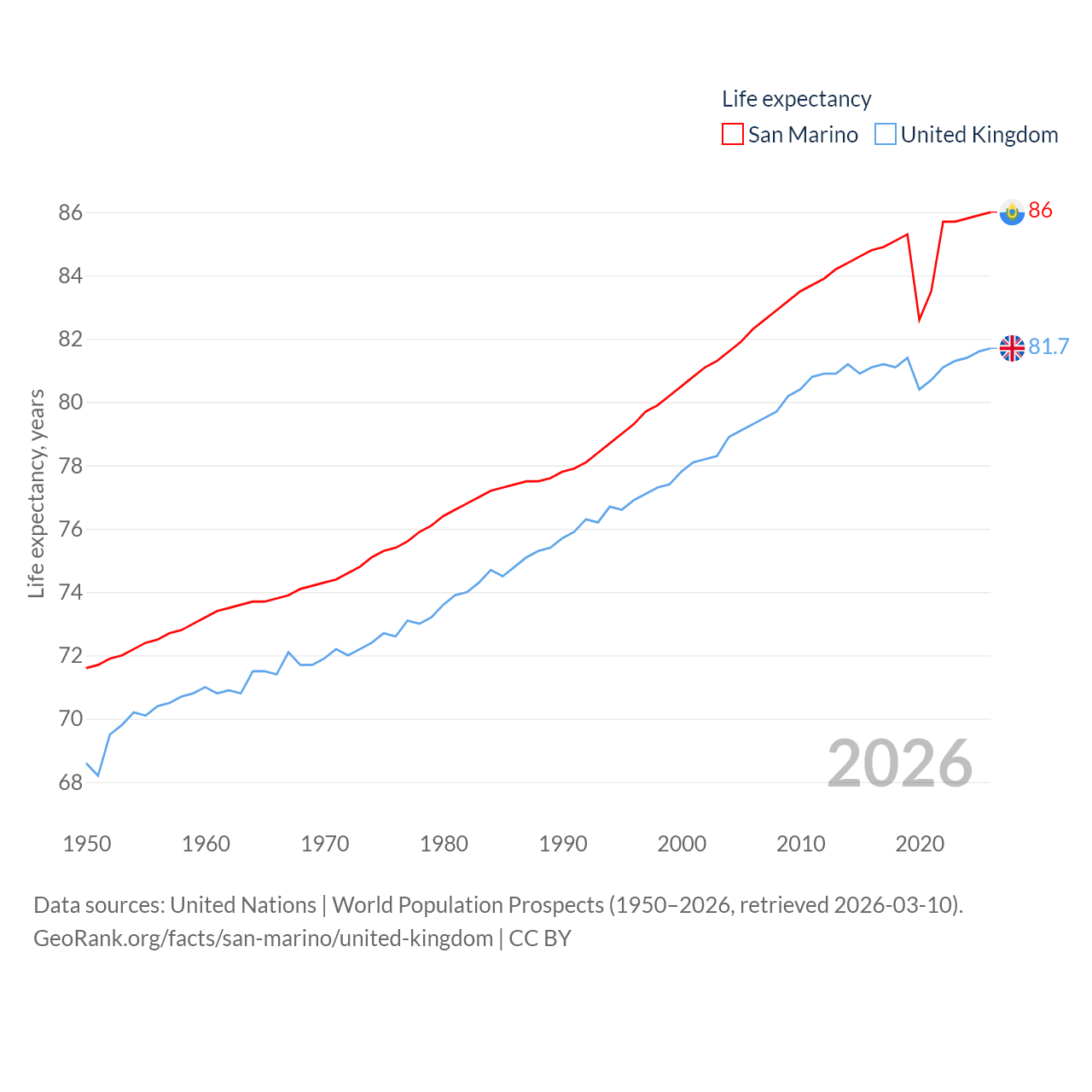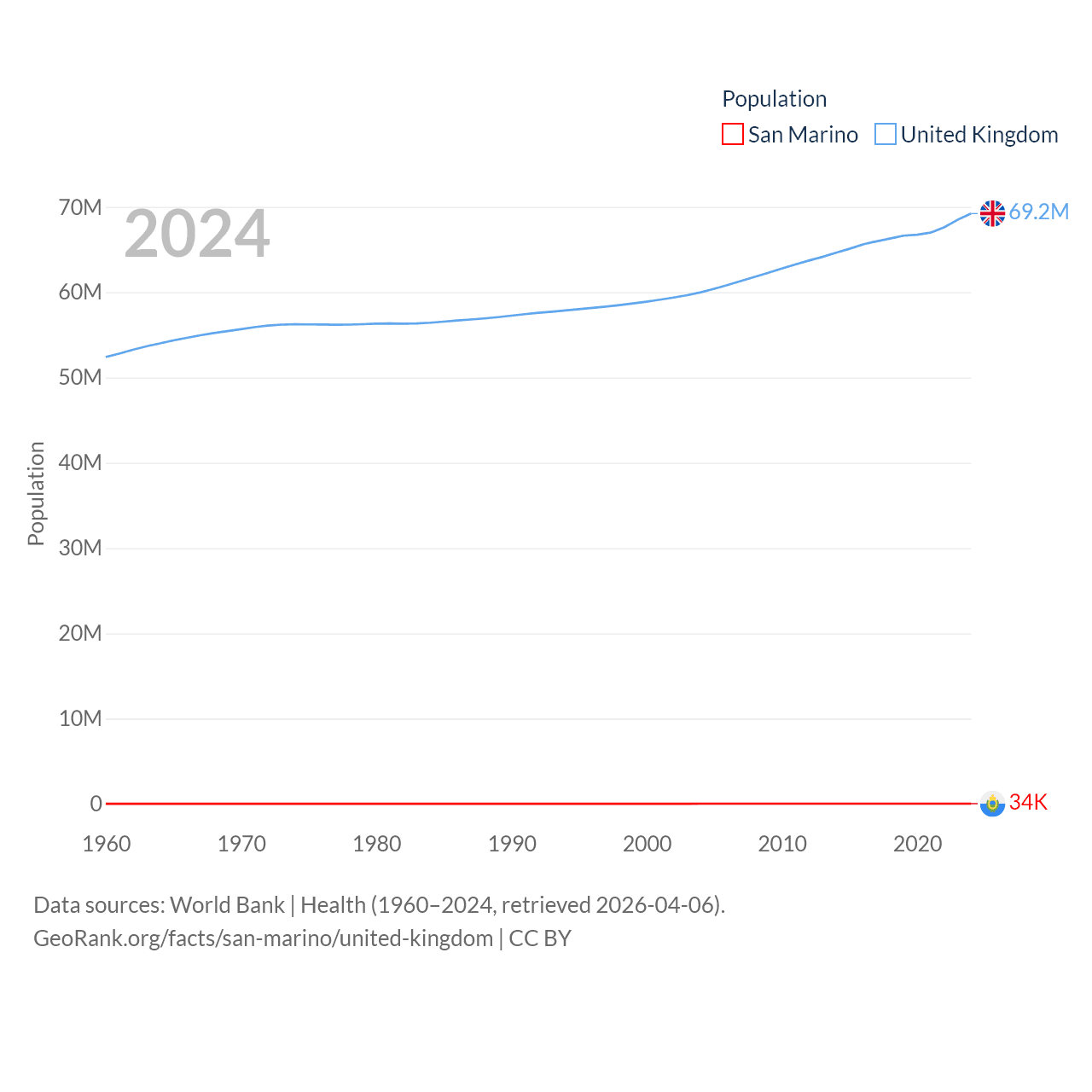 San Marino has a population of 34K (ranked 193/197), compared with 69.2M in The United Kingdom (ranked 21/197). San Marino's land area is 23.2 sq mi versus 93,410 sq mi for The United Kingdom (ranked 193rd vs. 78th).
