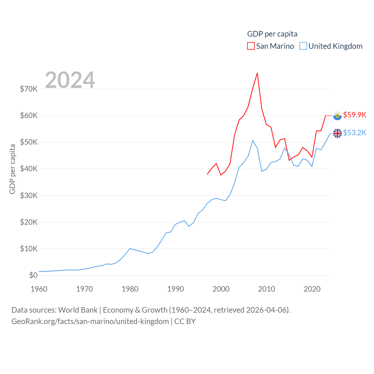 By GDP, San Marino ranks 180/197 ($2.03B) and The United Kingdom ranks 6/197 ($3.69T). By GDP per capita, San Marino ranks 15/197 ($59,880), while The United Kingdom ranks 22/197 ($53,246).