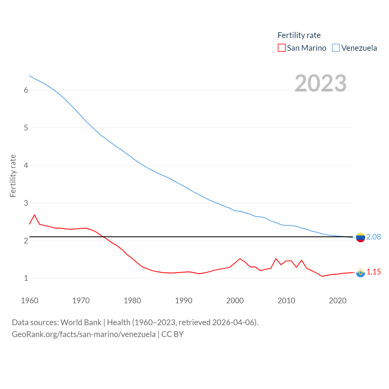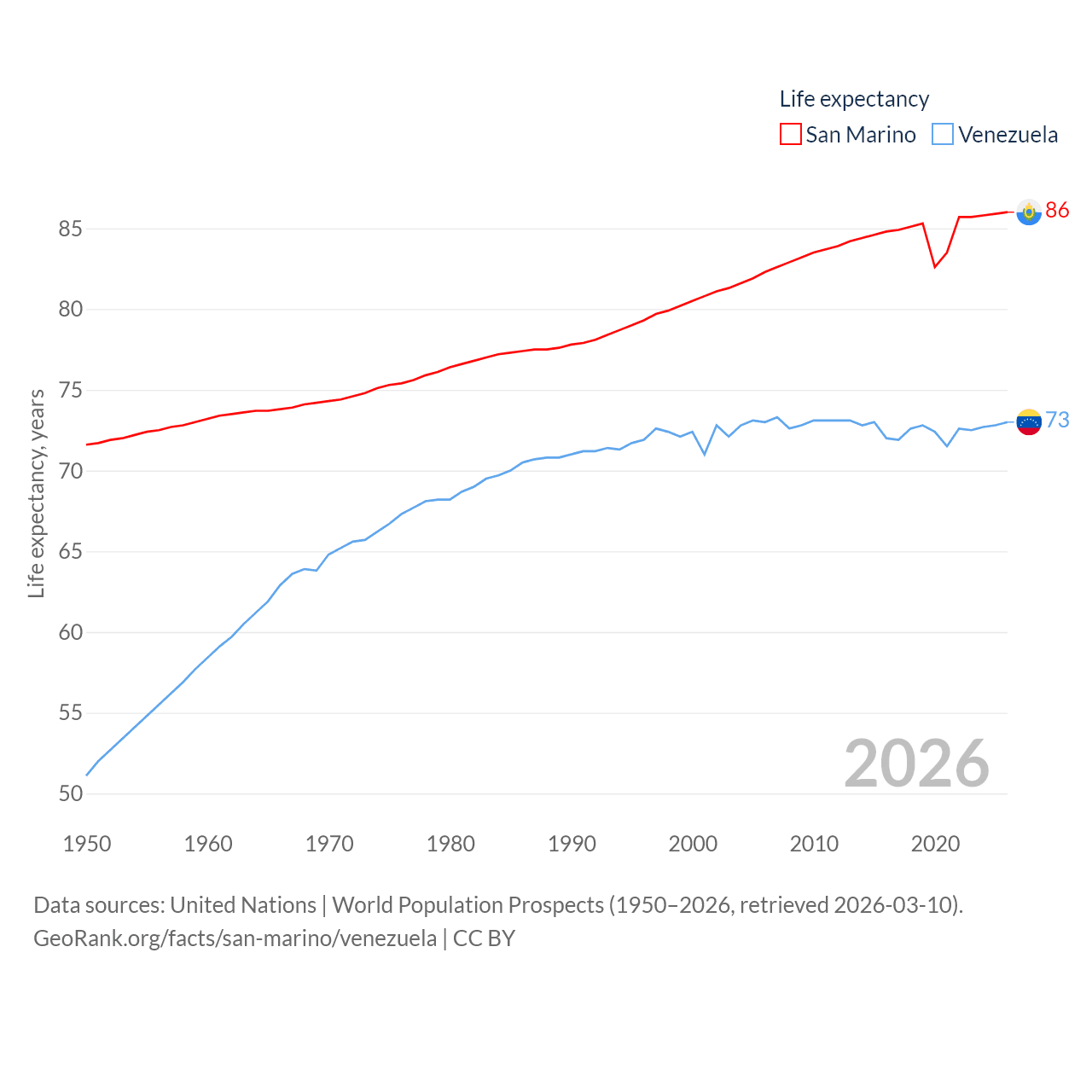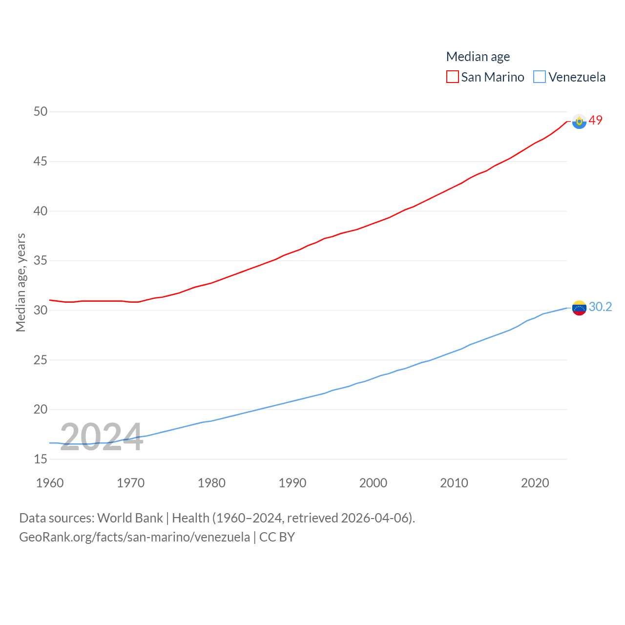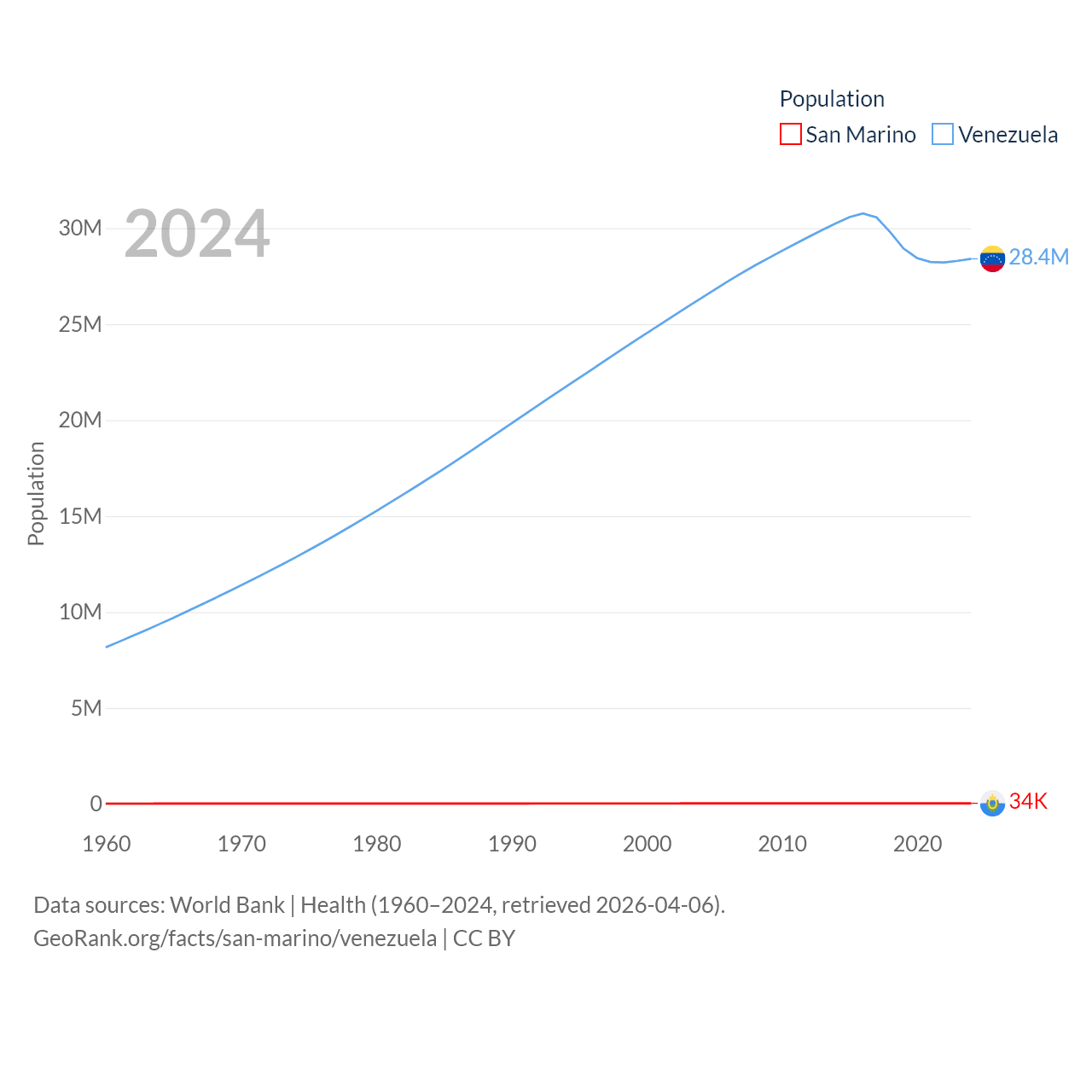 San Marino has a population of 34K (ranked 193/197), compared with 28.4M in Venezuela (ranked 53/197). San Marino's land area is 23.2 sq mi versus 340,561 sq mi for Venezuela (ranked 193rd vs. 32nd).