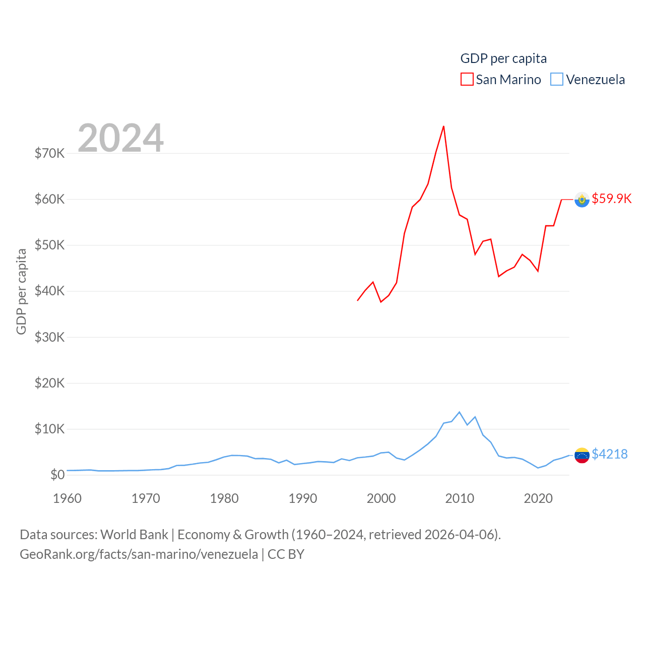 By GDP, San Marino ranks 180/197 ($2.03B) and Venezuela ranks 65/197 ($120B). By GDP per capita, San Marino ranks 15/197 ($59,880), while Venezuela ranks 128/197 ($4,218).
