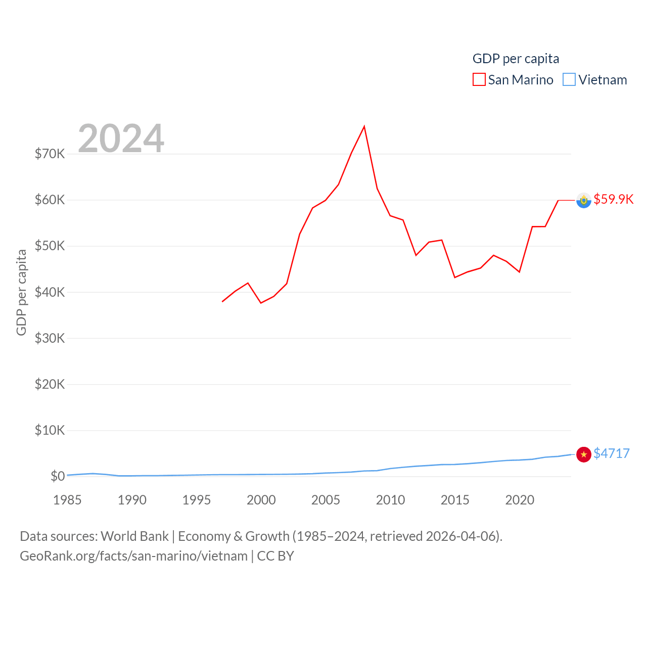 By GDP, San Marino ranks 180/197 ($2.03B) and Vietnam ranks 33/197 ($476B). By GDP per capita, San Marino ranks 15/197 ($59,880), while Vietnam ranks 122/197 ($4,717).