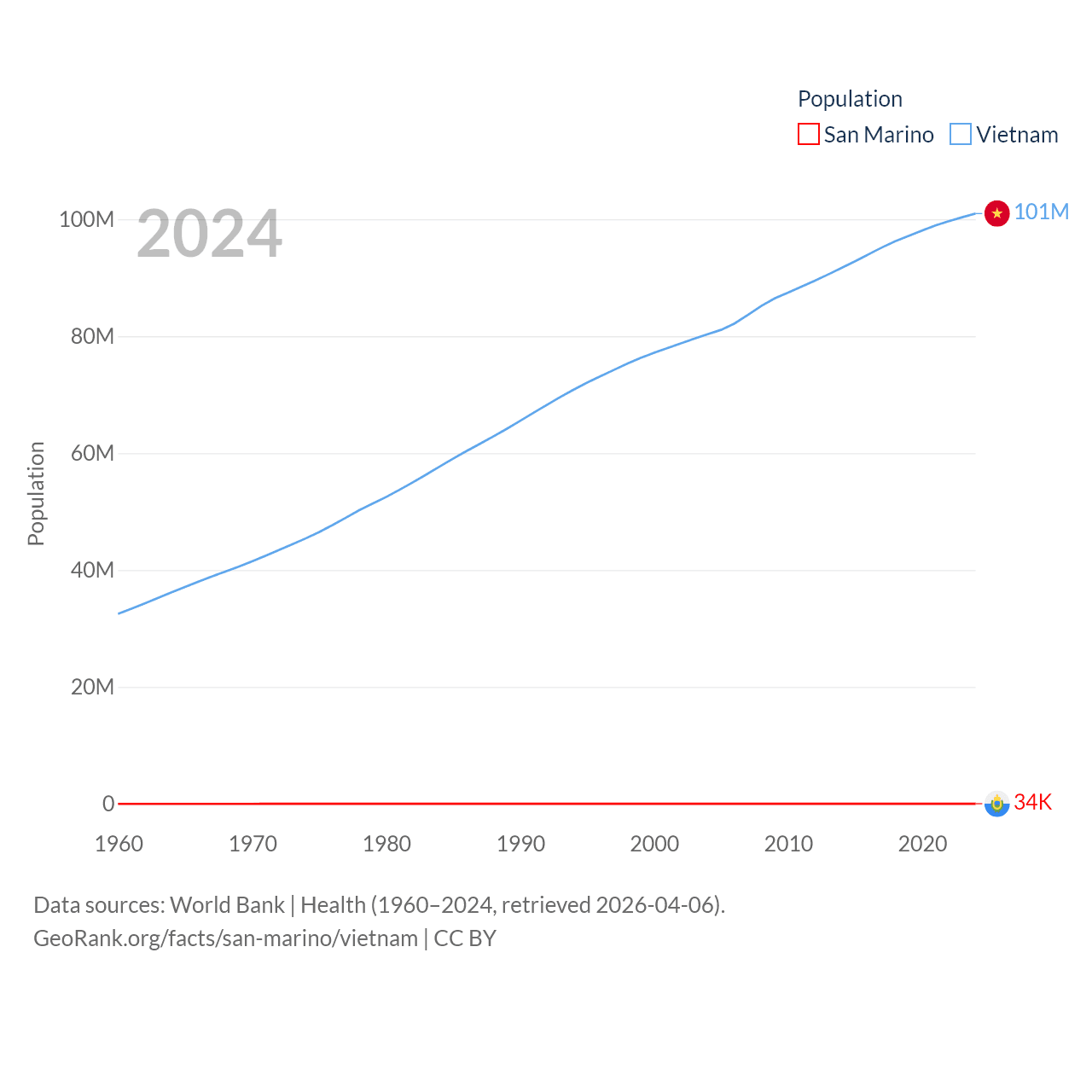 San Marino has a population of 34K (ranked 193/197), compared with 101M in Vietnam (ranked 16/197). San Marino's land area is 23.2 sq mi versus 121,016 sq mi for Vietnam (ranked 193rd vs. 67th).