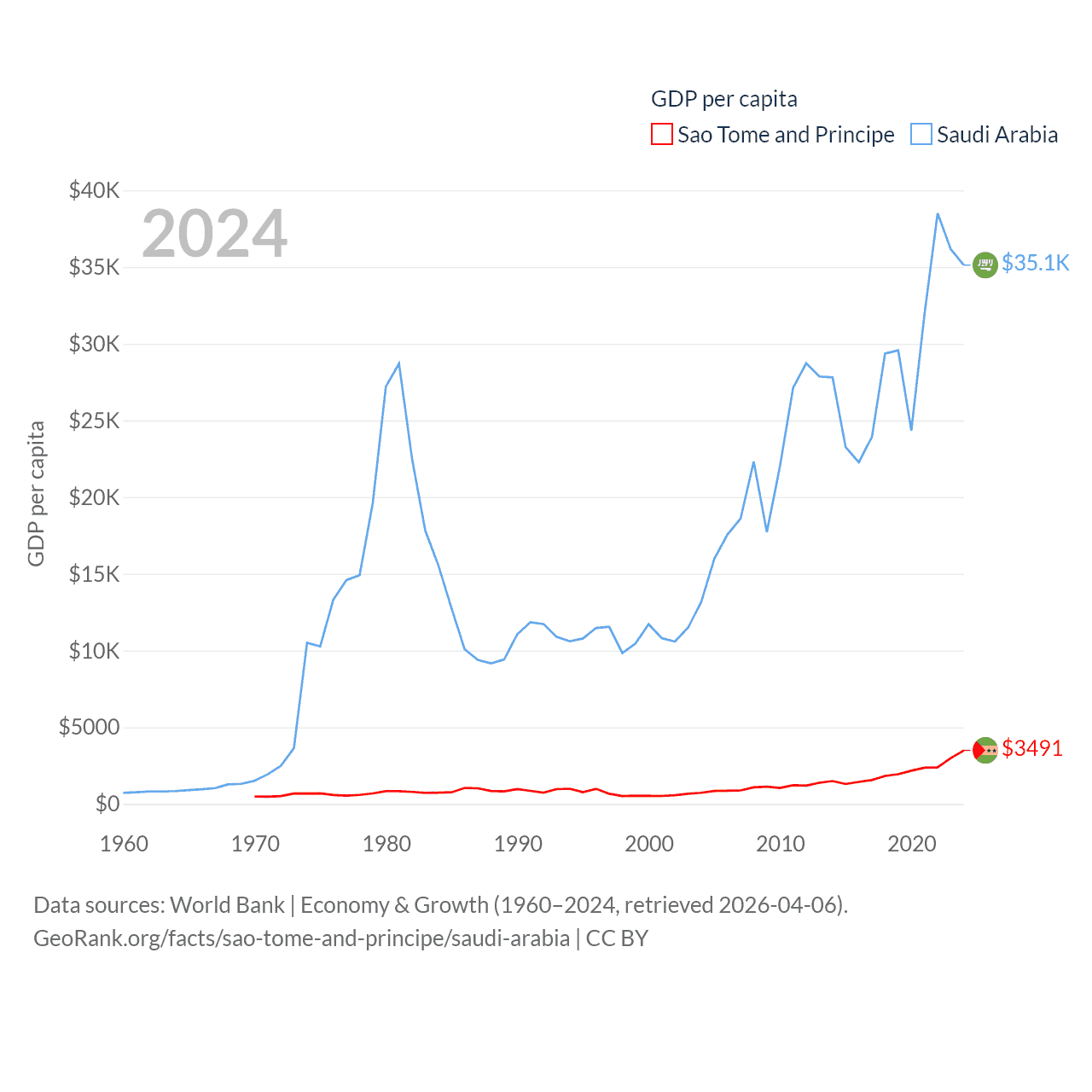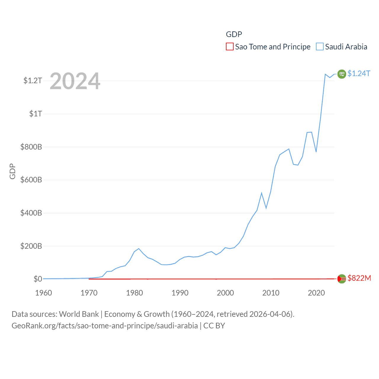 By GDP, Sao Tome and Principe ranks 189/197 ($822M) and Saudi Arabia ranks 18/197 ($1.24T). By GDP per capita, Sao Tome and Principe ranks 134/197 ($3,491), while Saudi Arabia ranks 33/197 ($35,122).