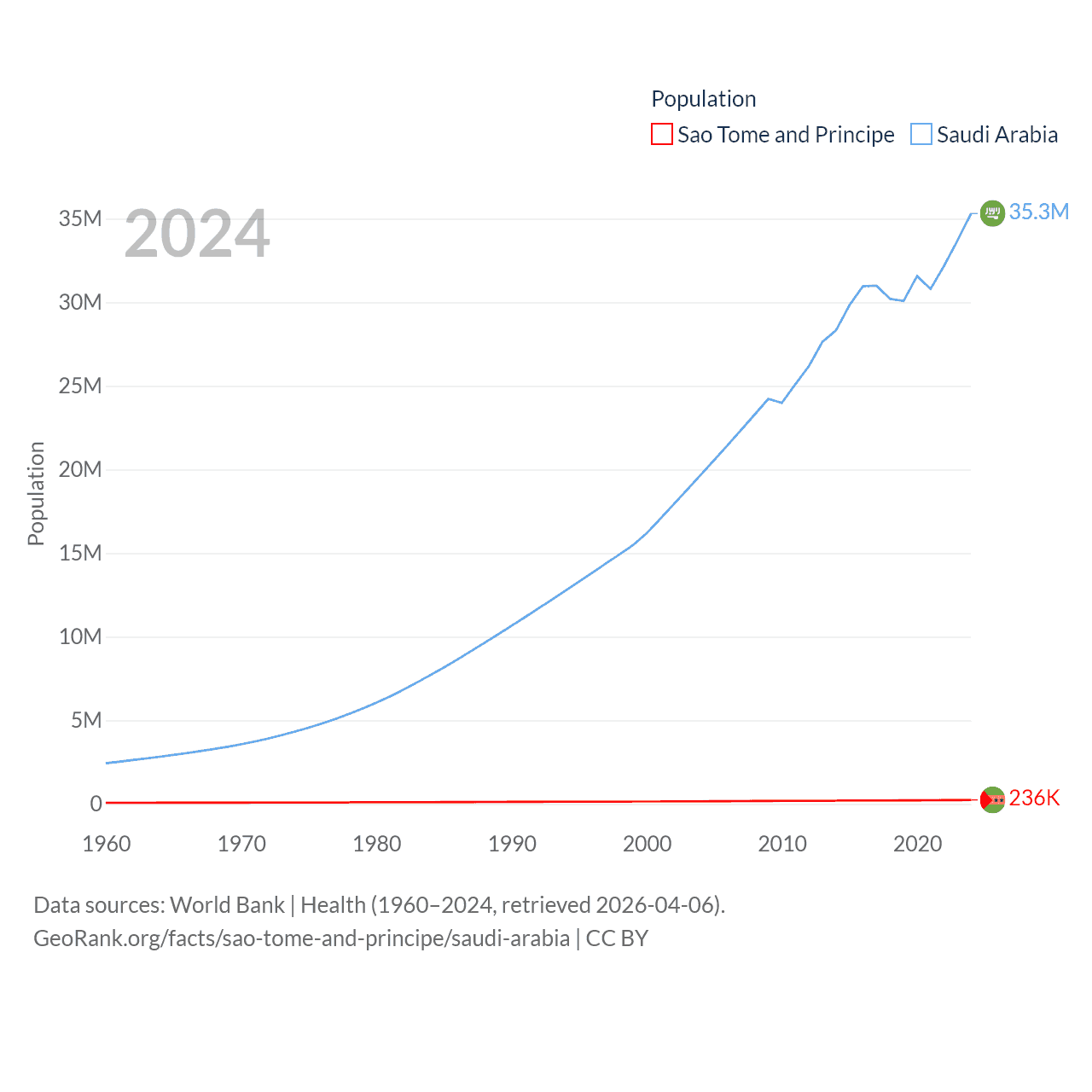 Sao Tome and Principe has a population of 236K (ranked 176/197), compared with 35.3M in Saudi Arabia (ranked 45/197). Sao Tome and Principe's land area is 371 sq mi versus 830,000 sq mi for Saudi Arabia (ranked 172nd vs. 12th).