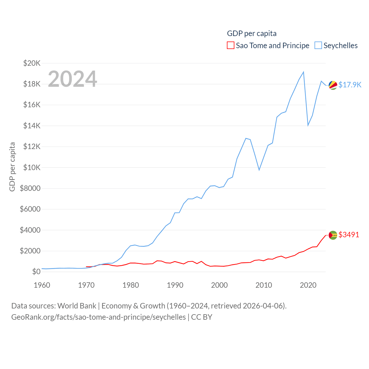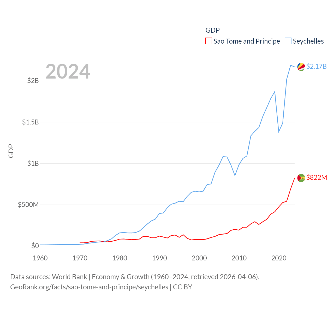By GDP, Sao Tome and Principe ranks 189/197 ($822M) and The Seychelles ranks 178/197 ($2.17B). By GDP per capita, Sao Tome and Principe ranks 134/197 ($3,491), while The Seychelles ranks 63/197 ($17,859).