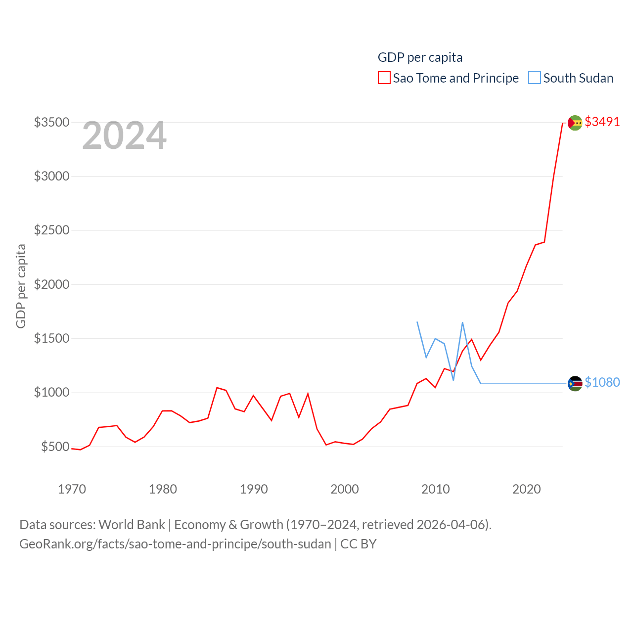 By GDP, Sao Tome and Principe ranks 189/197 ($822M) and South Sudan ranks 149/197 ($12B). By GDP per capita, Sao Tome and Principe ranks 134/197 ($3,491), while South Sudan ranks 175/197 ($1,080).