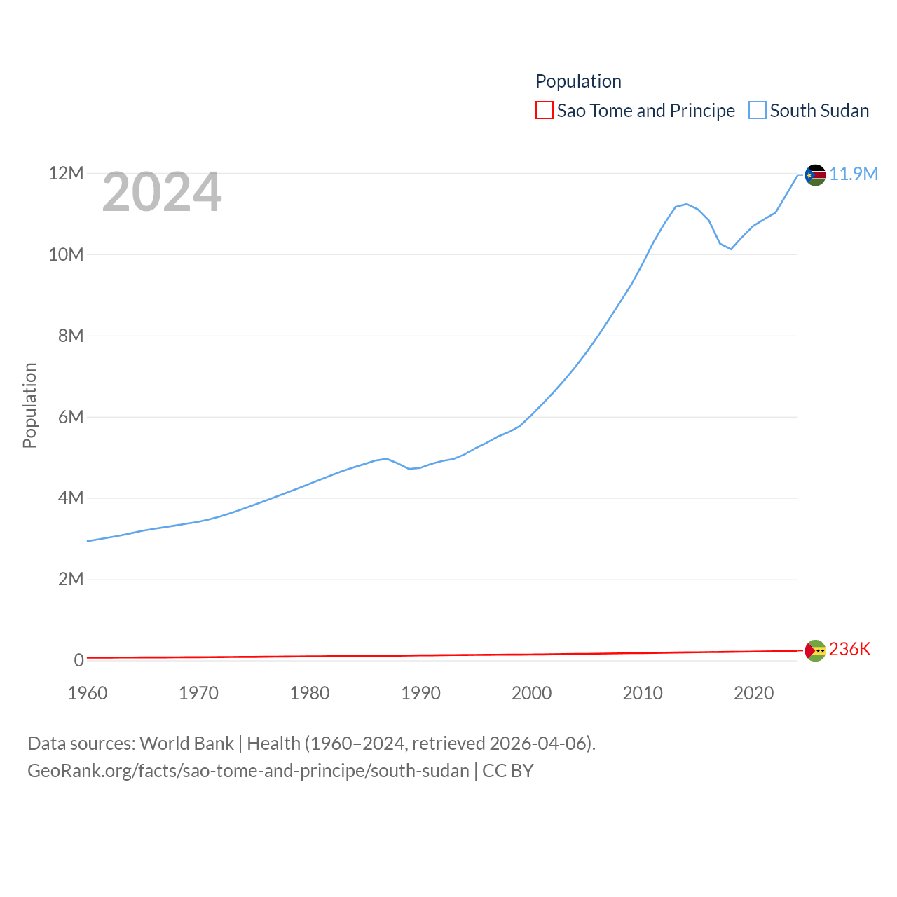 Sao Tome and Principe has a population of 236K (ranked 176/197), compared with 11.9M in South Sudan (ranked 81/197). Sao Tome and Principe's land area is 371 sq mi versus 243,990 sq mi for South Sudan (ranked 172nd vs. 41st).