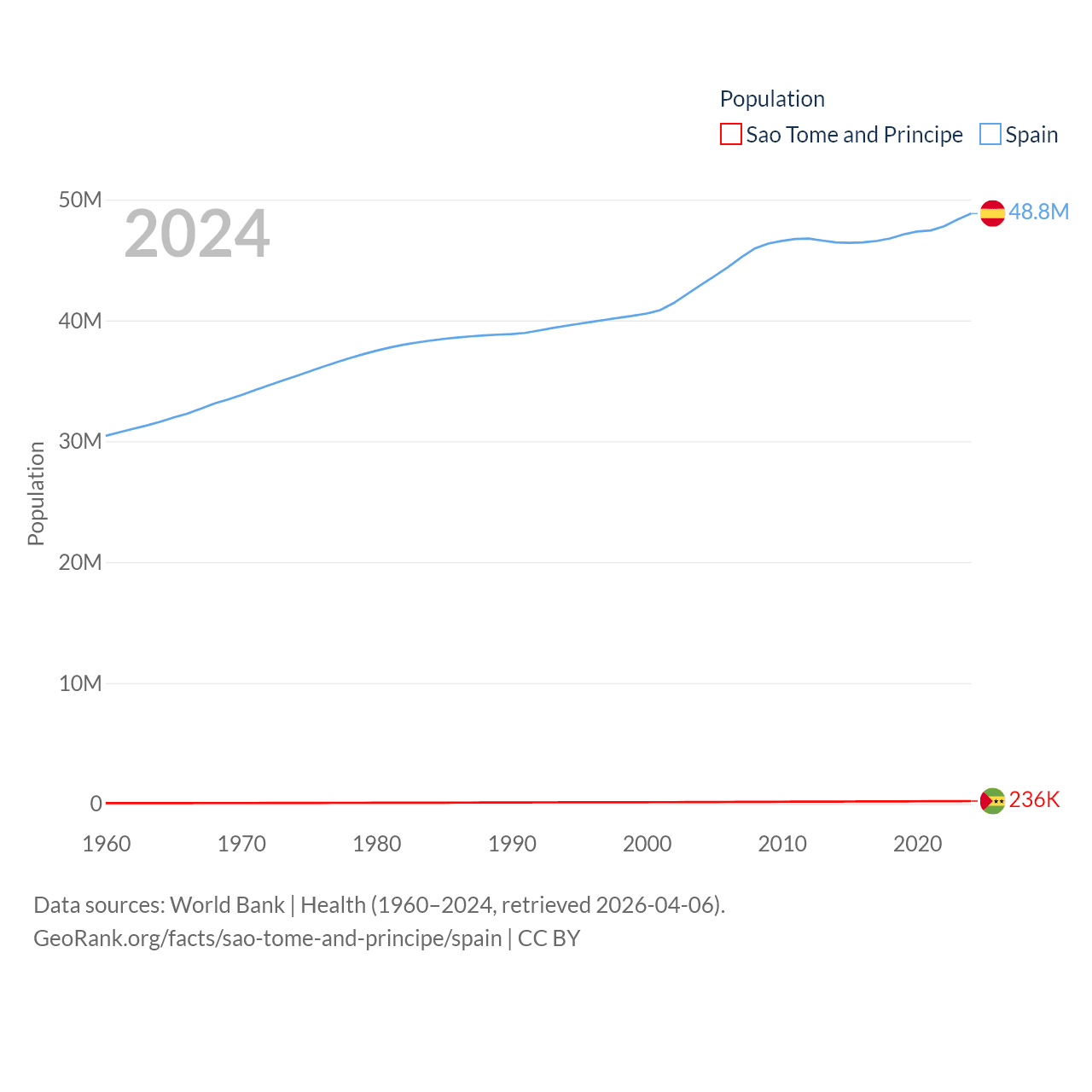 Sao Tome and Principe has a population of 236K (ranked 176/197), compared with 48.8M in Spain (ranked 32/197). Sao Tome and Principe's land area is 371 sq mi versus 192,934 sq mi for Spain (ranked 172nd vs. 51st).