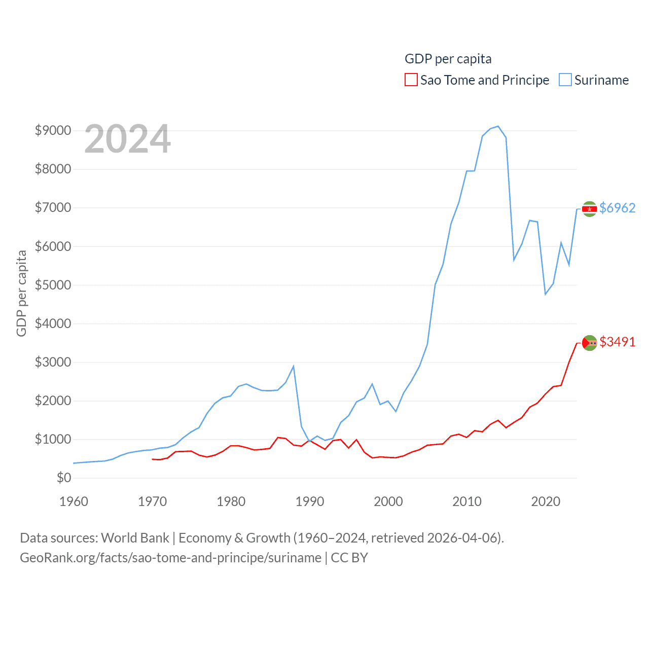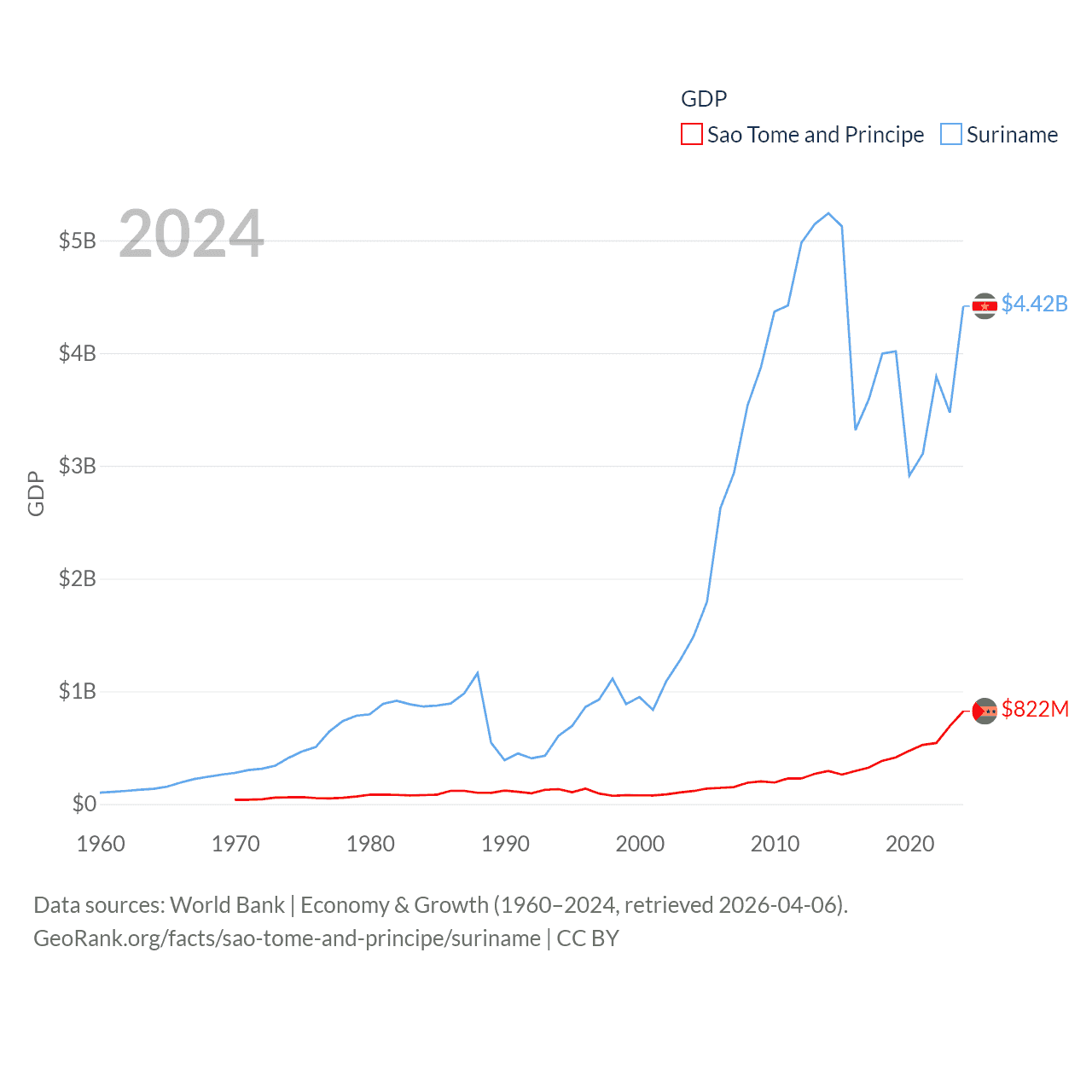 By GDP, Sao Tome and Principe ranks 189/197 ($822M) and Suriname ranks 164/197 ($4.42B). By GDP per capita, Sao Tome and Principe ranks 134/197 ($3,491), while Suriname ranks 102/197 ($6,962).