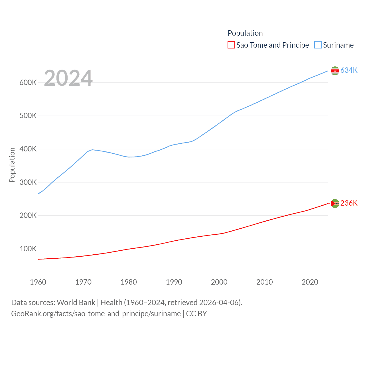 Sao Tome and Principe has a population of 236K (ranked 176/197), compared with 634K in Suriname (ranked 165/197). Sao Tome and Principe's land area is 371 sq mi versus 61,972 sq mi for Suriname (ranked 172nd vs. 90th).
