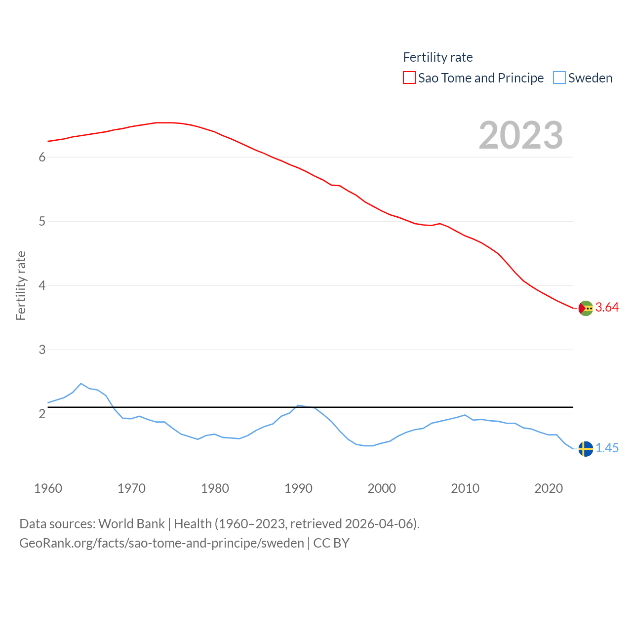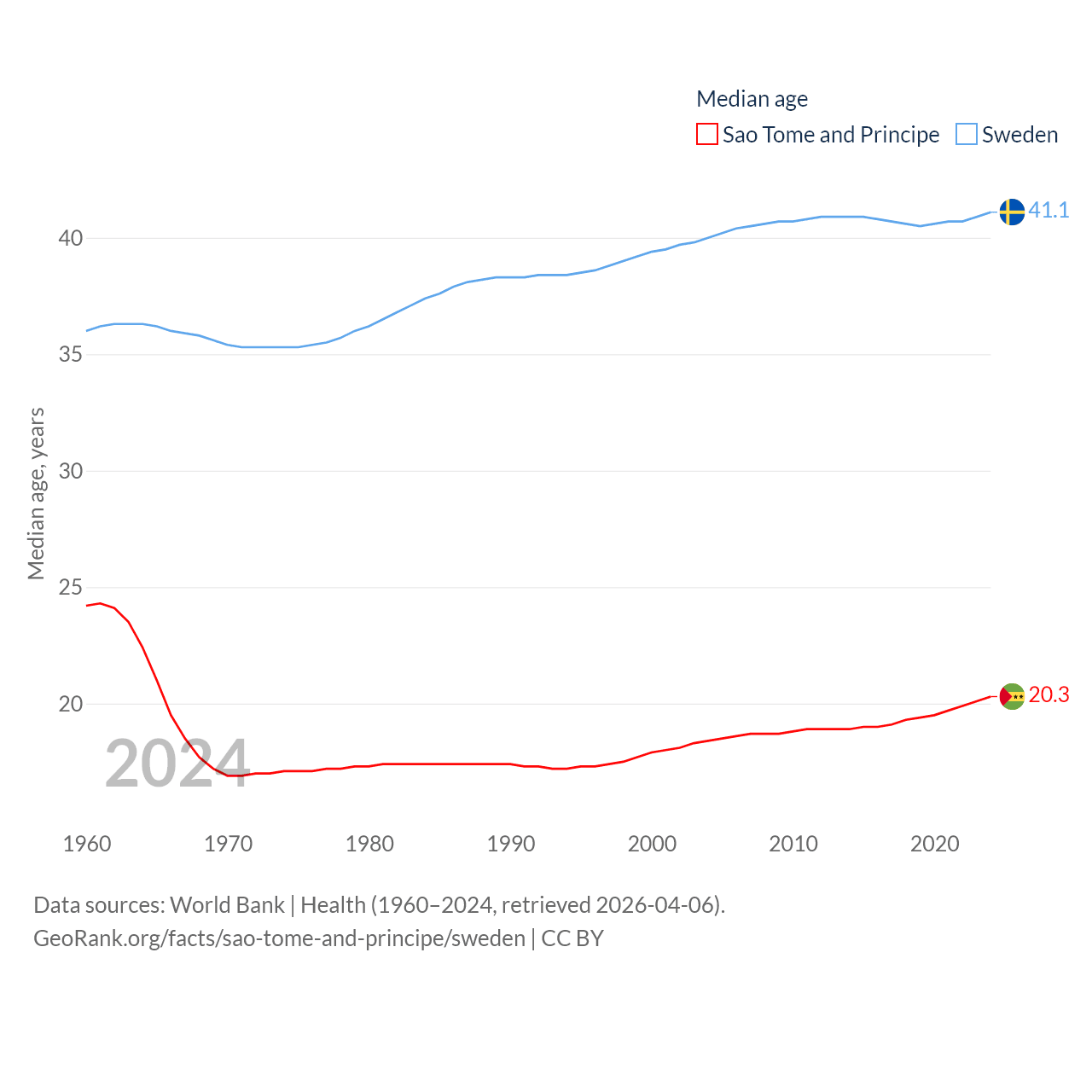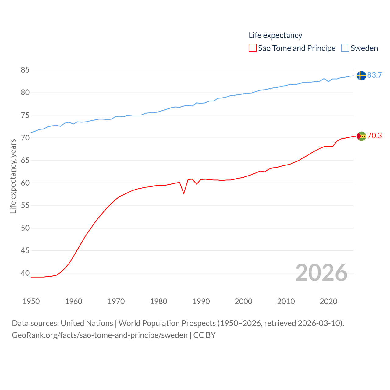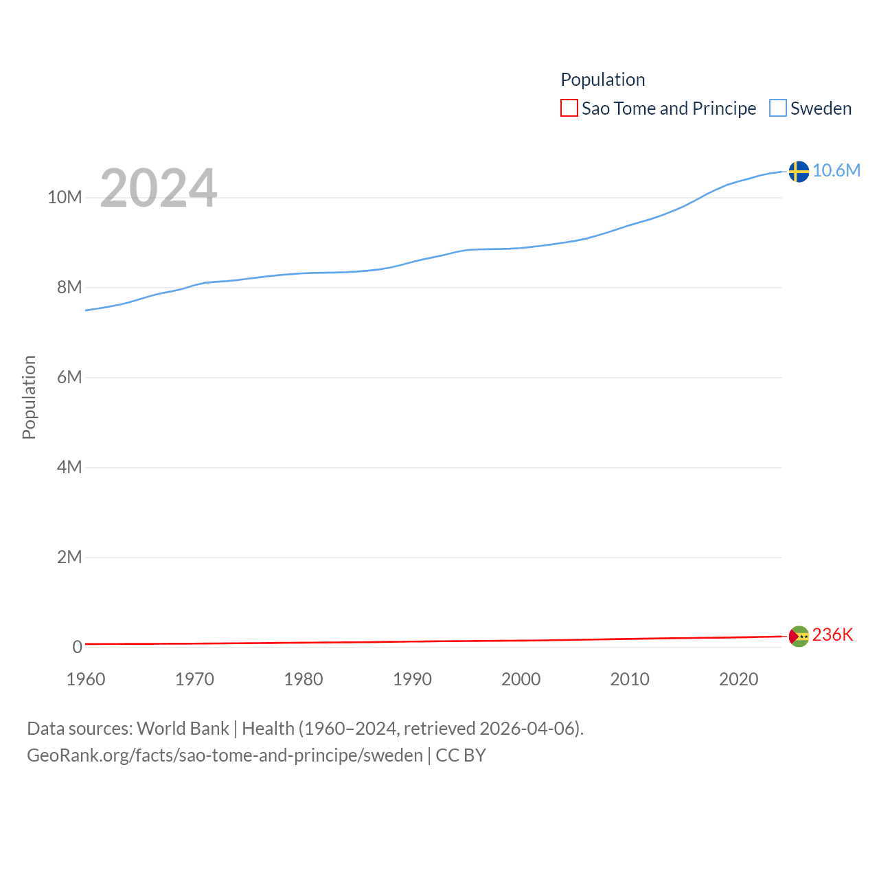 Sao Tome and Principe has a population of 236K (ranked 176/197), compared with 10.6M in Sweden (ranked 93/197). Sao Tome and Principe's land area is 371 sq mi versus 157,248 sq mi for Sweden (ranked 172nd vs. 58th).