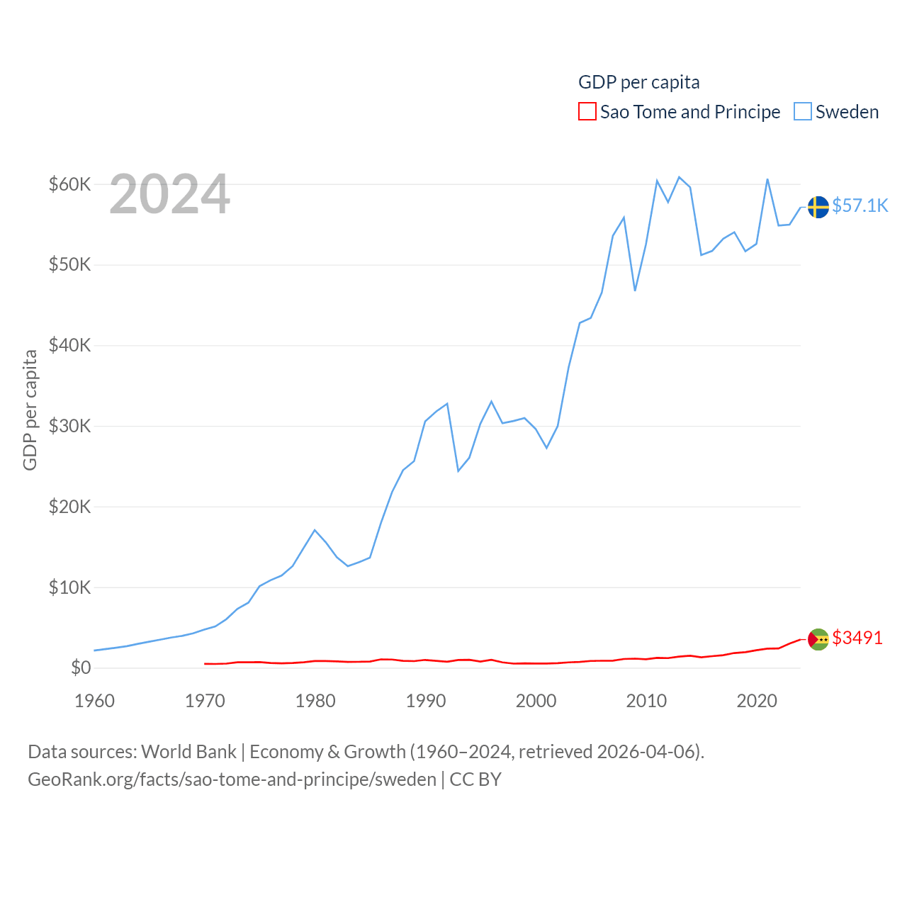 By GDP, Sao Tome and Principe ranks 189/197 ($822M) and Sweden ranks 26/197 ($604B). By GDP per capita, Sao Tome and Principe ranks 134/197 ($3,491), while Sweden ranks 17/197 ($57,117).