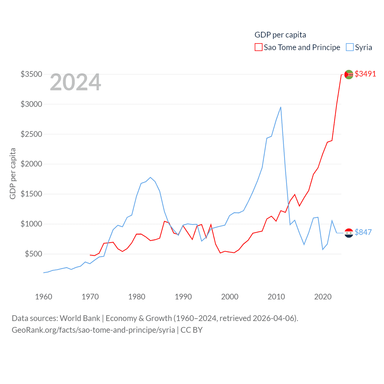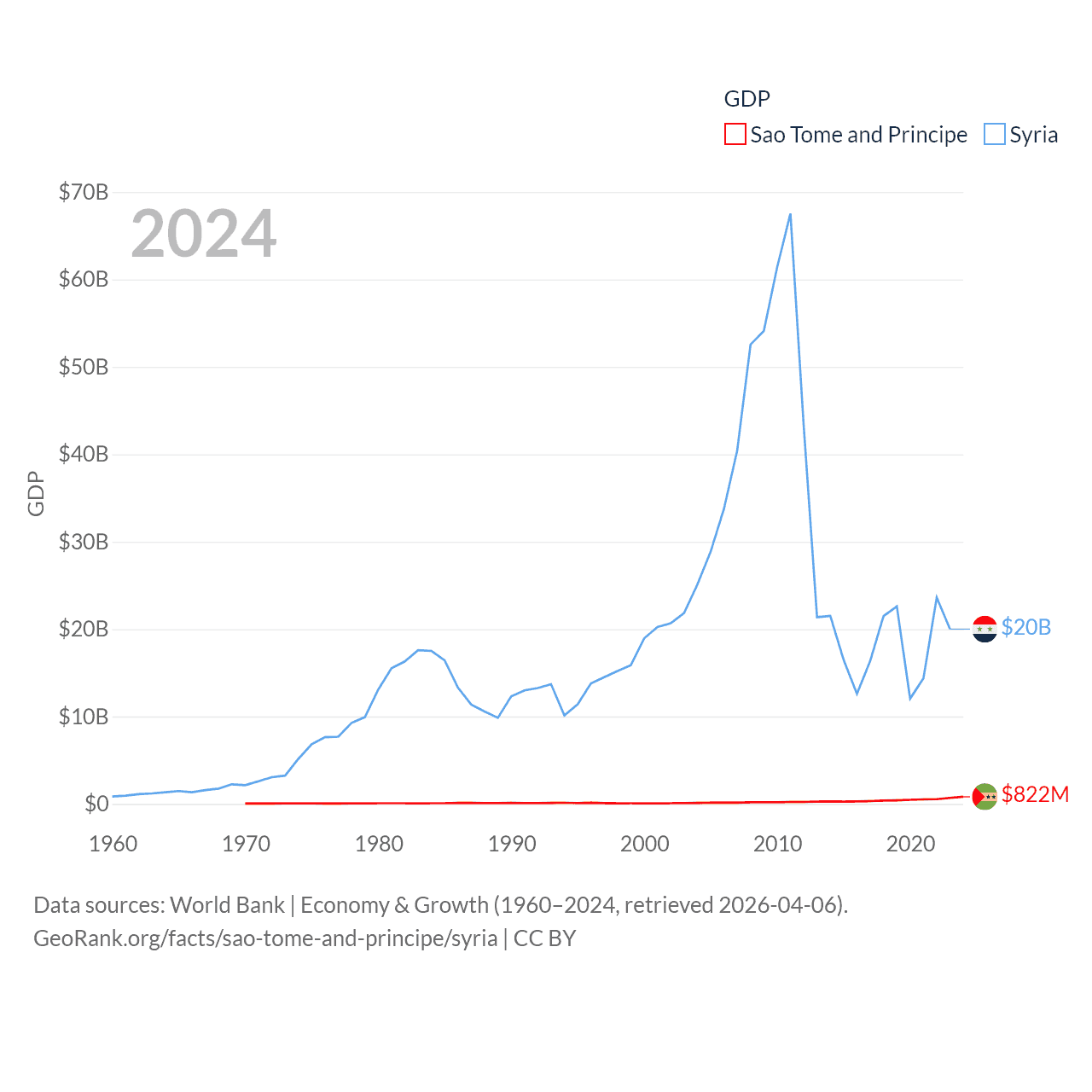 By GDP, Sao Tome and Principe ranks 189/197 ($822M) and Syria ranks 129/197 ($20B). By GDP per capita, Sao Tome and Principe ranks 134/197 ($3,491), while Syria ranks 185/197 ($847).