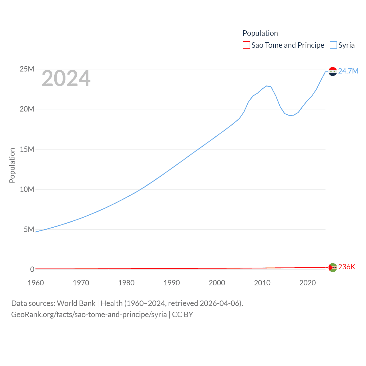 Sao Tome and Principe has a population of 236K (ranked 176/197), compared with 24.7M in Syria (ranked 57/197). Sao Tome and Principe's land area is 371 sq mi versus 70,900 sq mi for Syria (ranked 172nd vs. 87th).