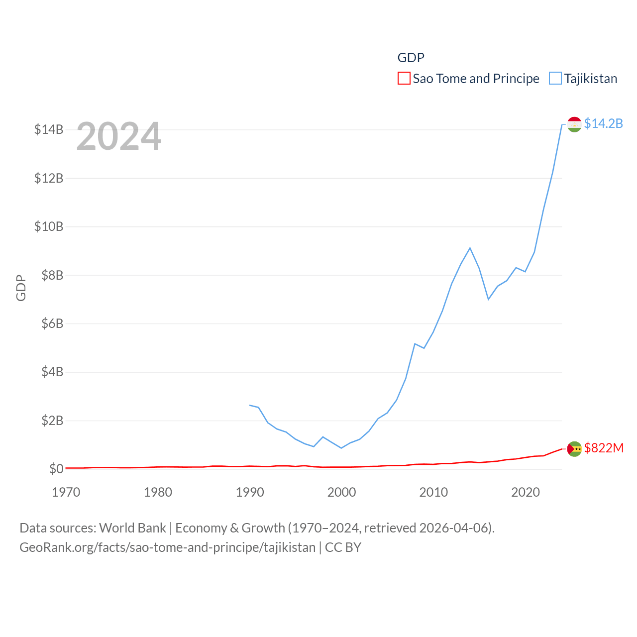 By GDP, Sao Tome and Principe ranks 189/197 ($822M) and Tajikistan ranks 145/197 ($14.2B). By GDP per capita, Sao Tome and Principe ranks 134/197 ($3,491), while Tajikistan ranks 166/197 ($1,341).