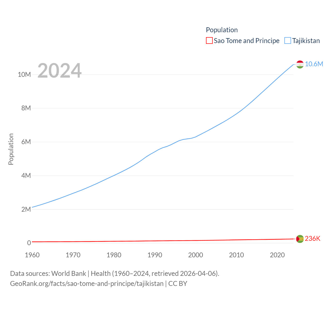 Sao Tome and Principe has a population of 236K (ranked 176/197), compared with 10.6M in Tajikistan (ranked 91/197). Sao Tome and Principe's land area is 371 sq mi versus 53,587 sq mi for Tajikistan (ranked 172nd vs. 93rd).