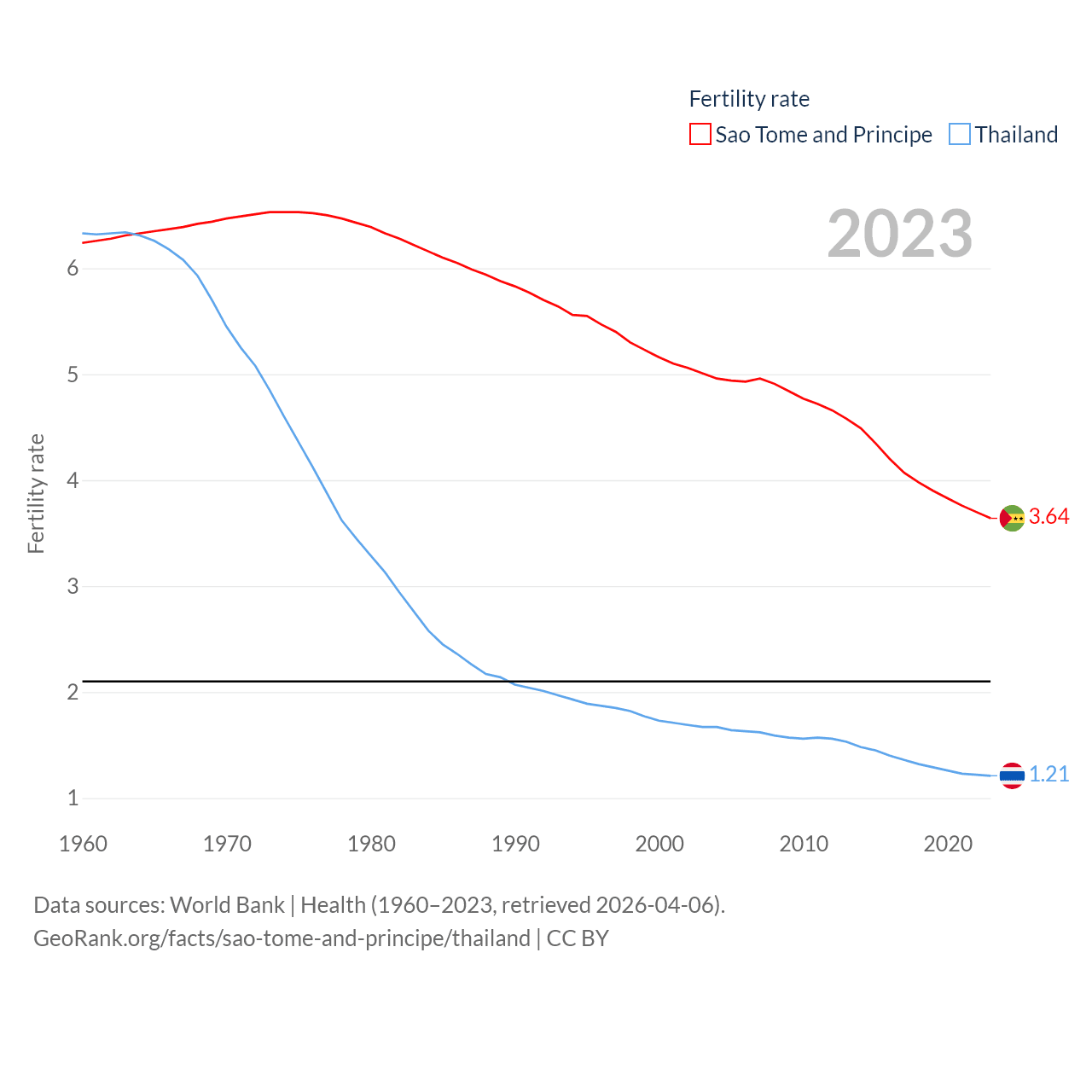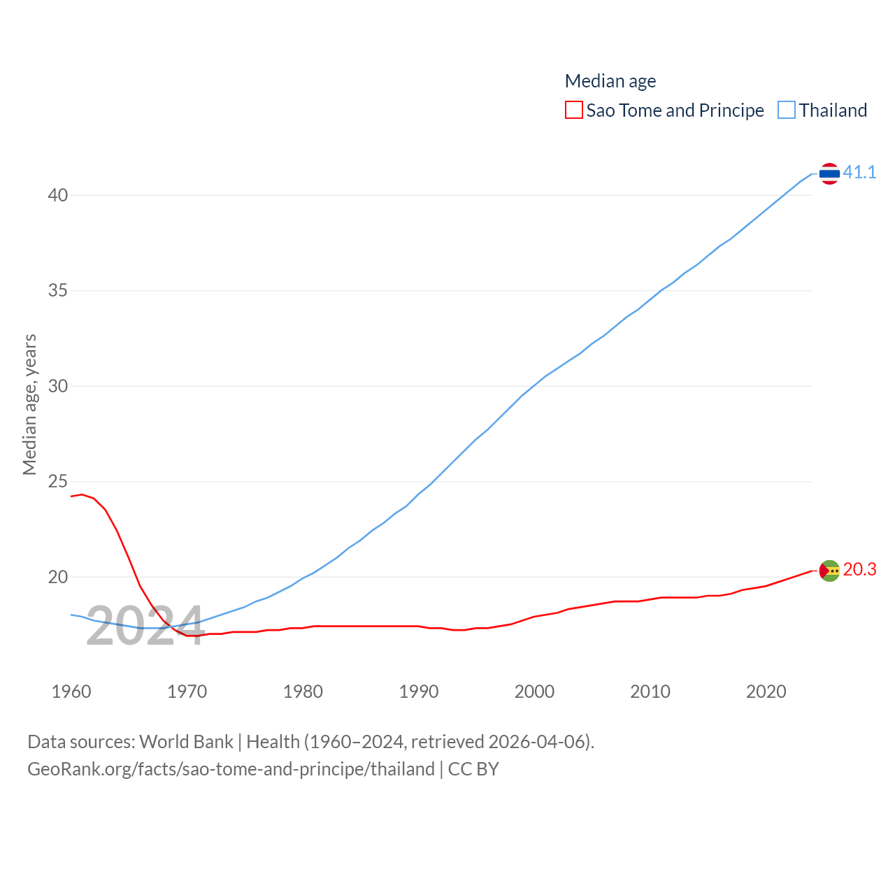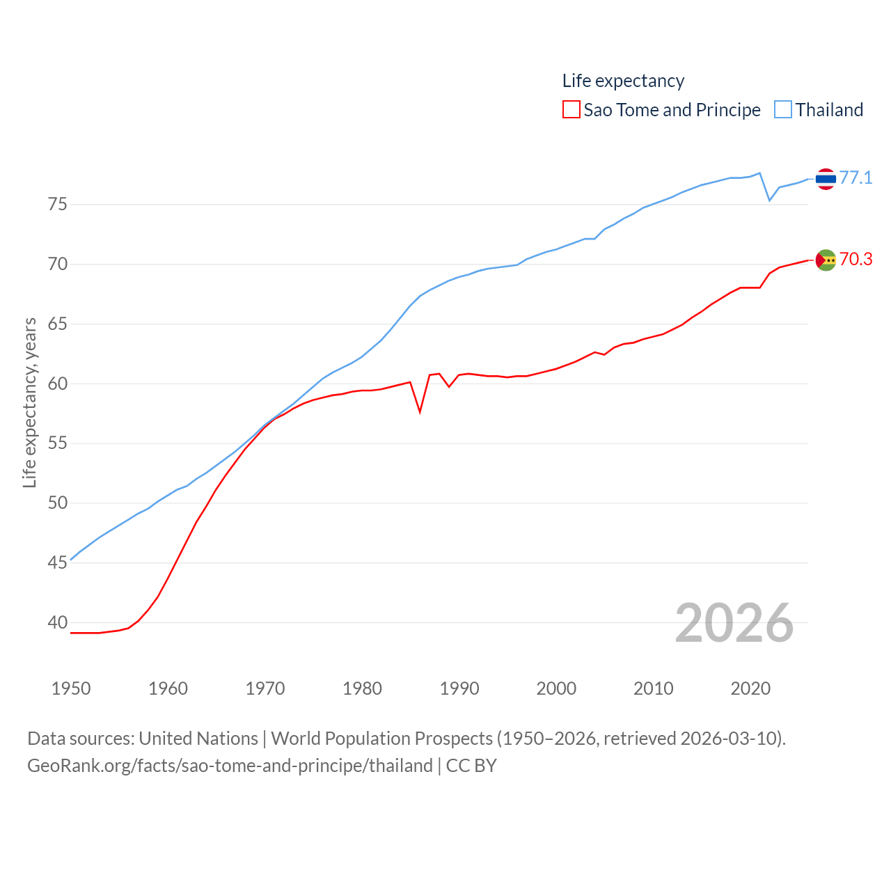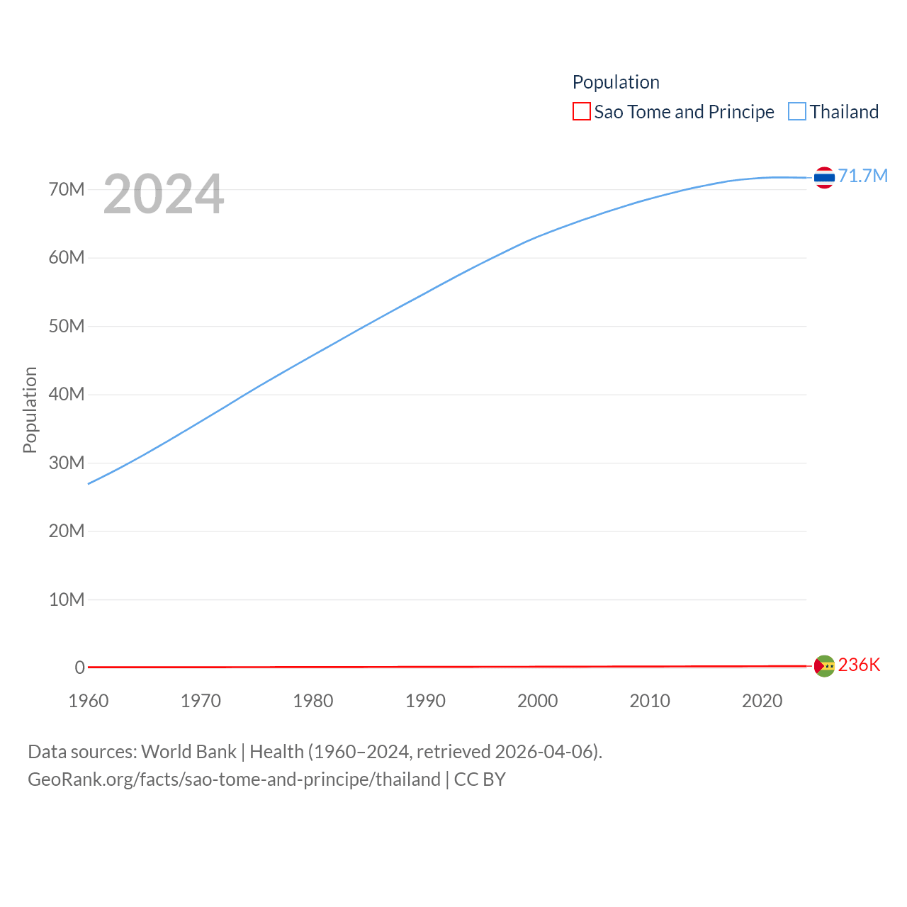 Sao Tome and Principe has a population of 236K (ranked 176/197), compared with 71.7M in Thailand (ranked 20/197). Sao Tome and Principe's land area is 371 sq mi versus 197,256 sq mi for Thailand (ranked 172nd vs. 50th).