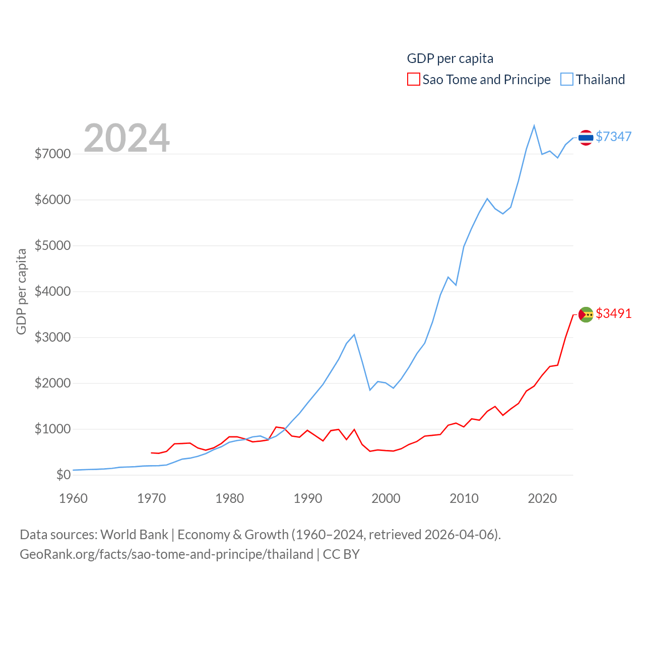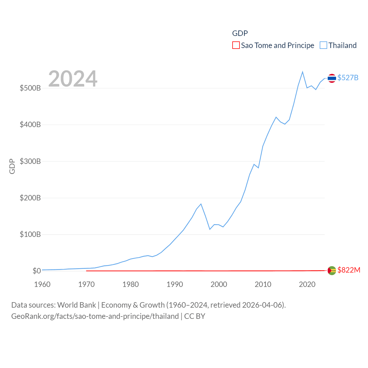 By GDP, Sao Tome and Principe ranks 189/197 ($822M) and Thailand ranks 31/197 ($527B). By GDP per capita, Sao Tome and Principe ranks 134/197 ($3,491), while Thailand ranks 100/197 ($7,347).