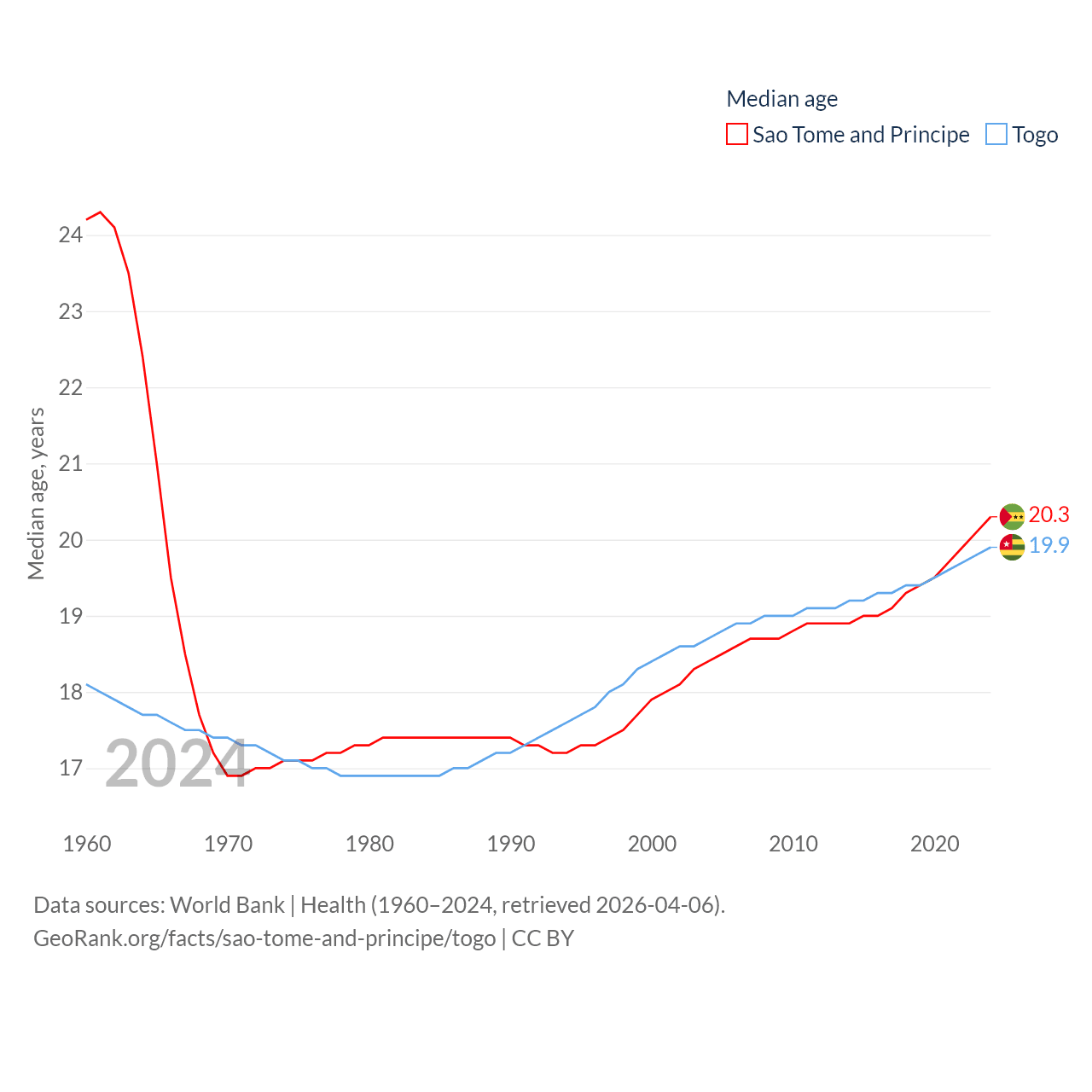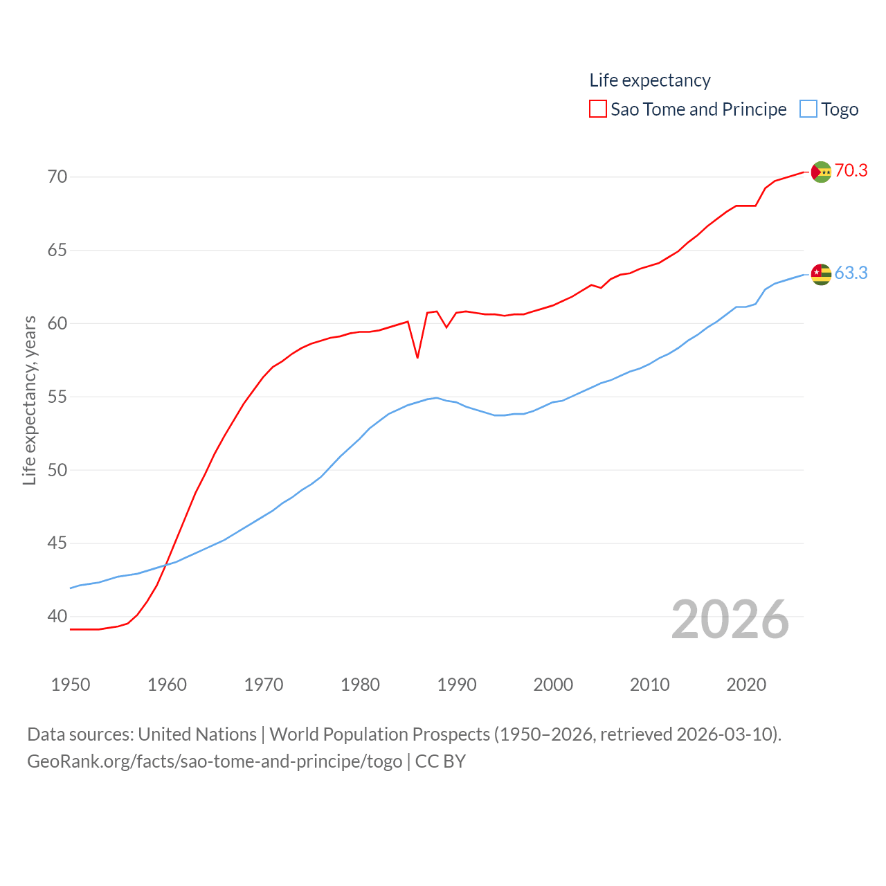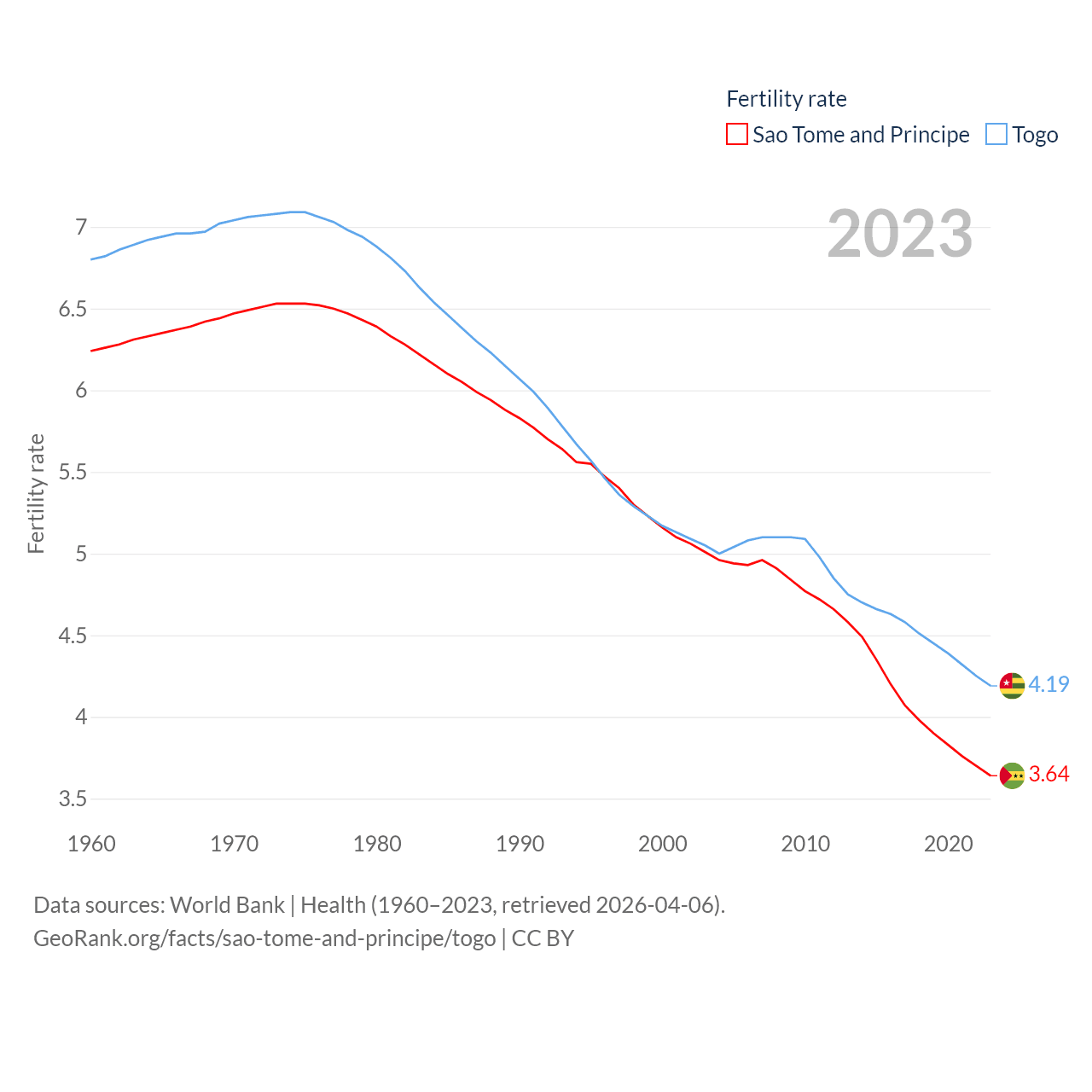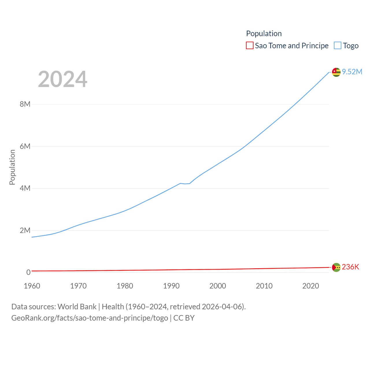 Sao Tome and Principe has a population of 236K (ranked 176/197), compared with 9.52M in Togo (ranked 98/197). Sao Tome and Principe's land area is 371 sq mi versus 21,000 sq mi for Togo (ranked 172nd vs. 124th).