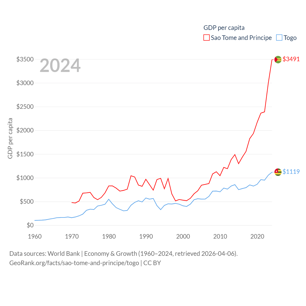By GDP, Sao Tome and Principe ranks 189/197 ($822M) and Togo ranks 154/197 ($10.7B). By GDP per capita, Sao Tome and Principe ranks 134/197 ($3,491), while Togo ranks 172/197 ($1,119).