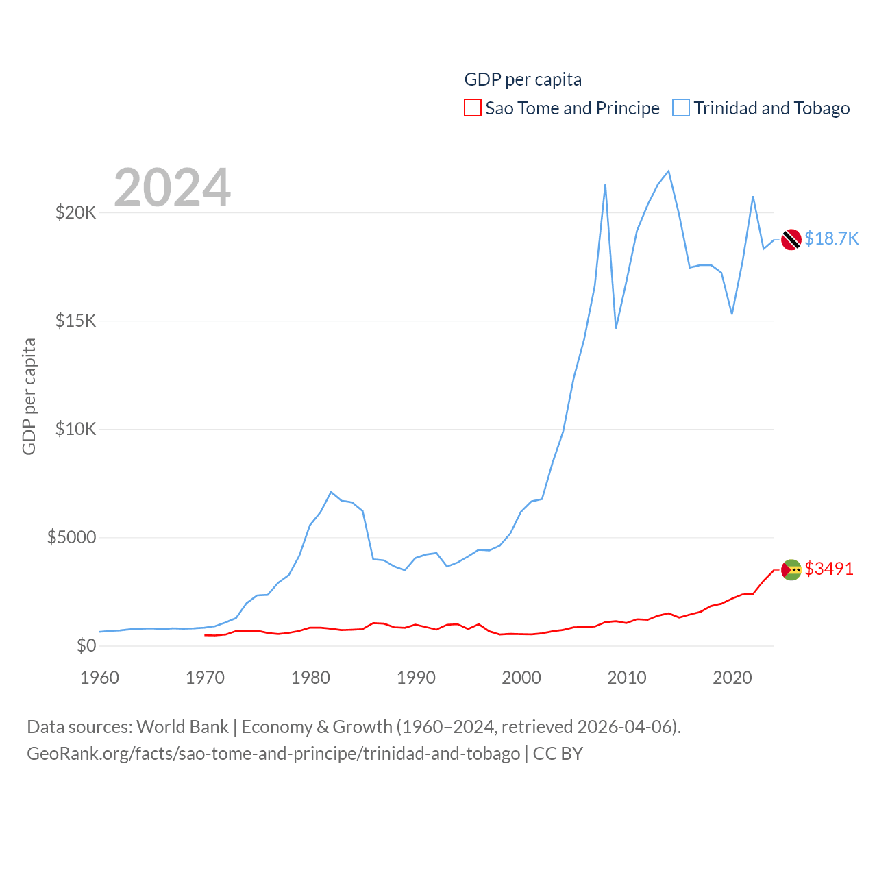 By GDP, Sao Tome and Principe ranks 189/197 ($822M) and Trinidad and Tobago ranks 115/197 ($25.6B). By GDP per capita, Sao Tome and Principe ranks 134/197 ($3,491), while Trinidad and Tobago ranks 61/197 ($18,733).
