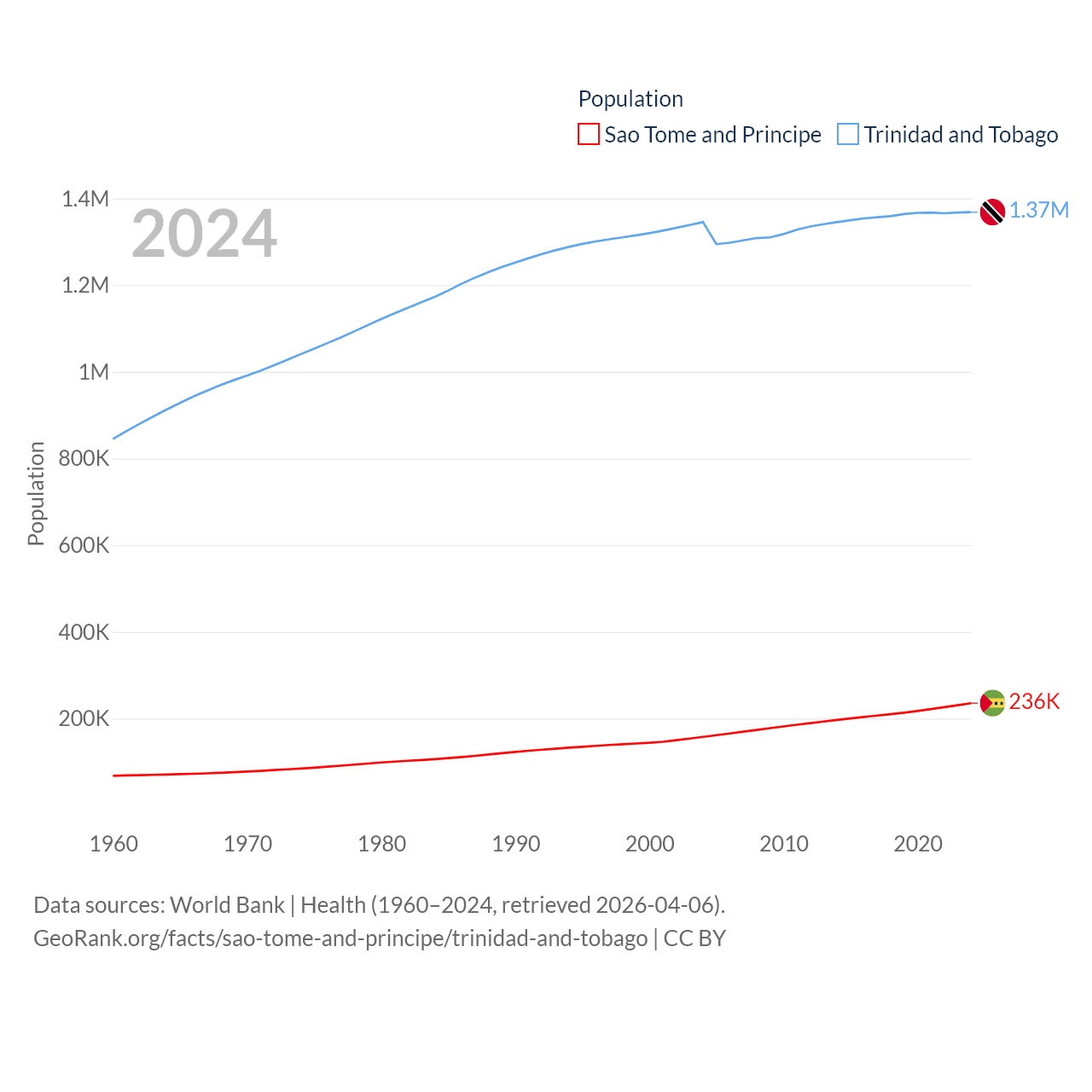 Sao Tome and Principe has a population of 236K (ranked 176/197), compared with 1.37M in Trinidad and Tobago (ranked 154/197). Sao Tome and Principe's land area is 371 sq mi versus 1,981 sq mi for Trinidad and Tobago (ranked 172nd vs. 166th).