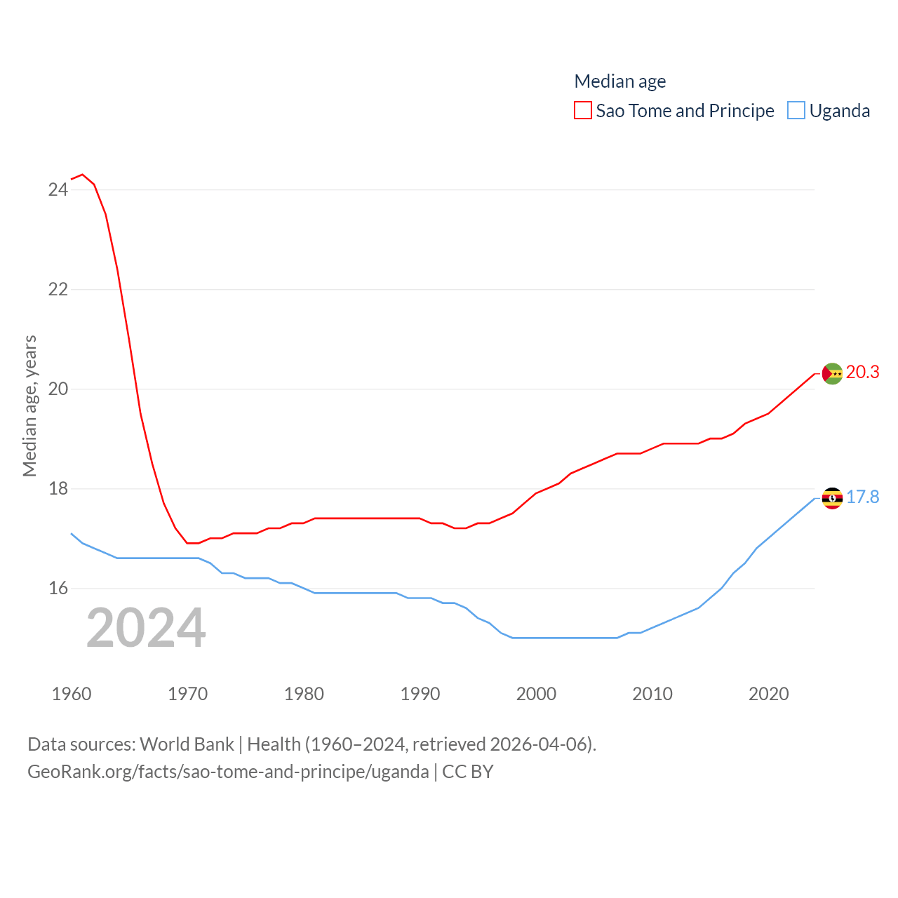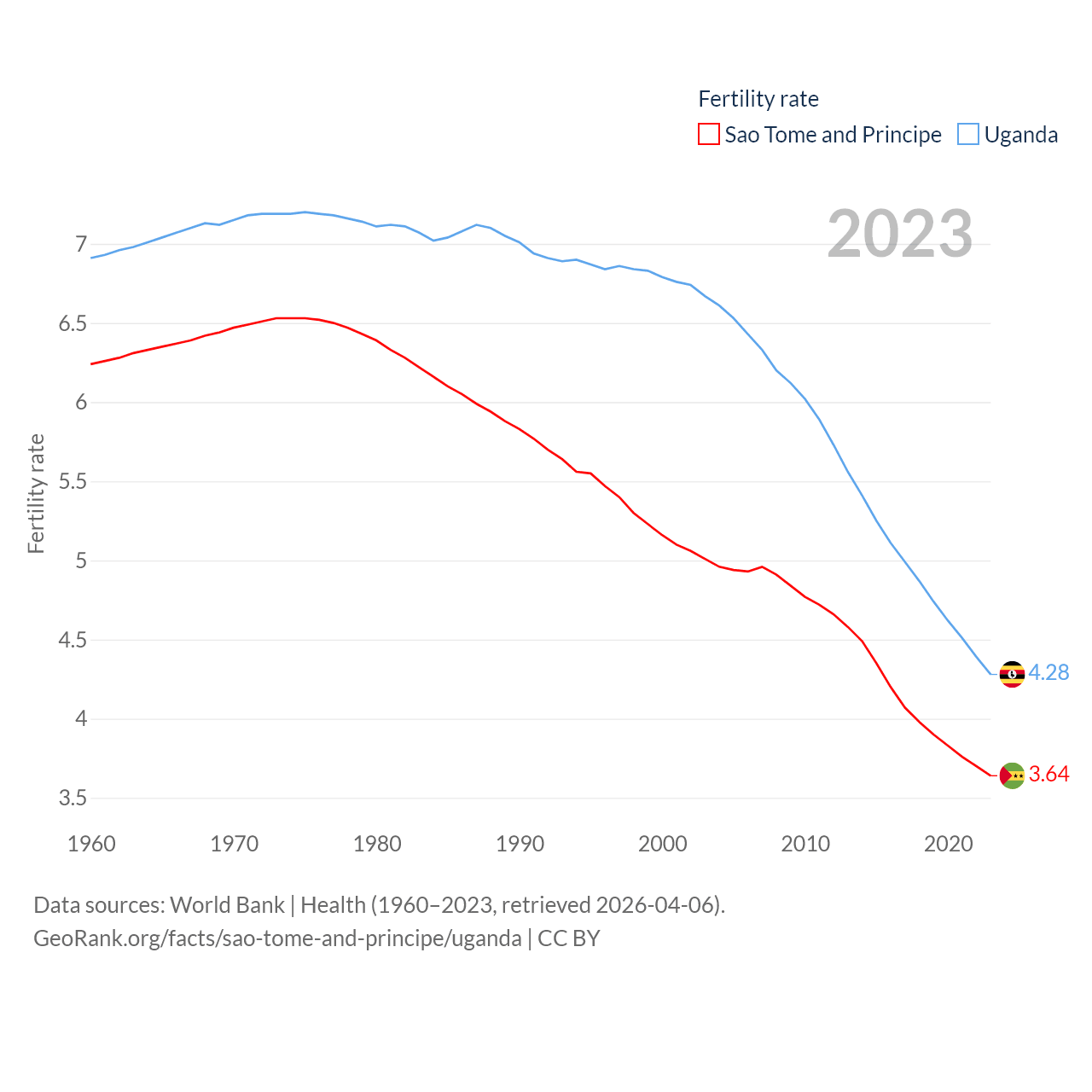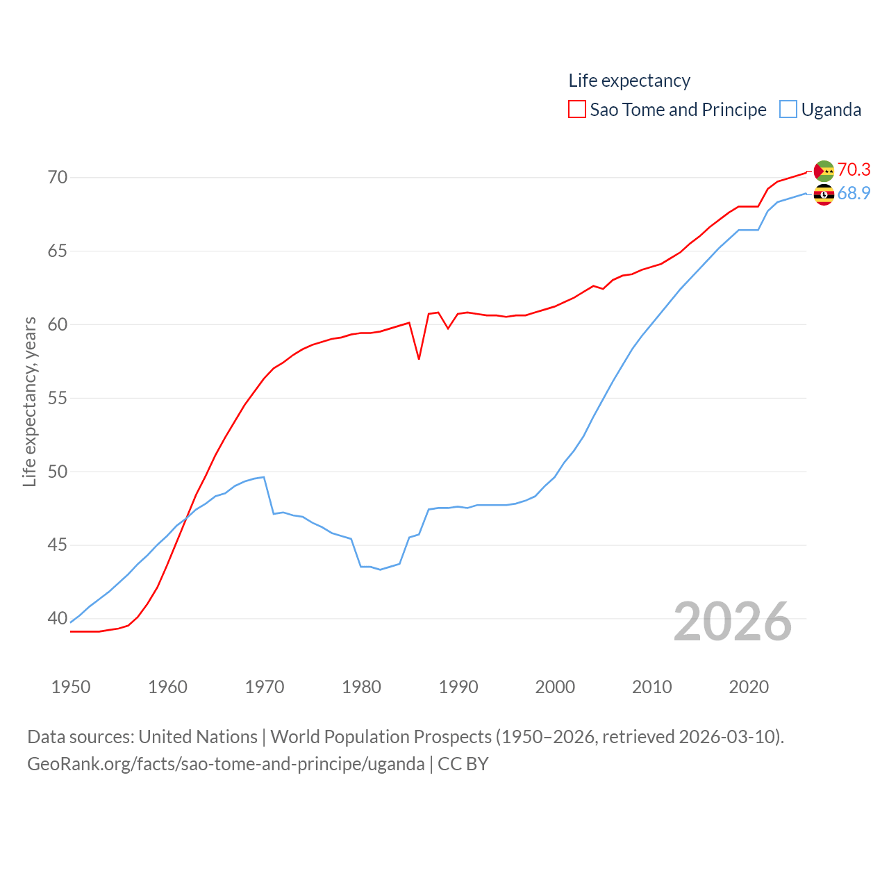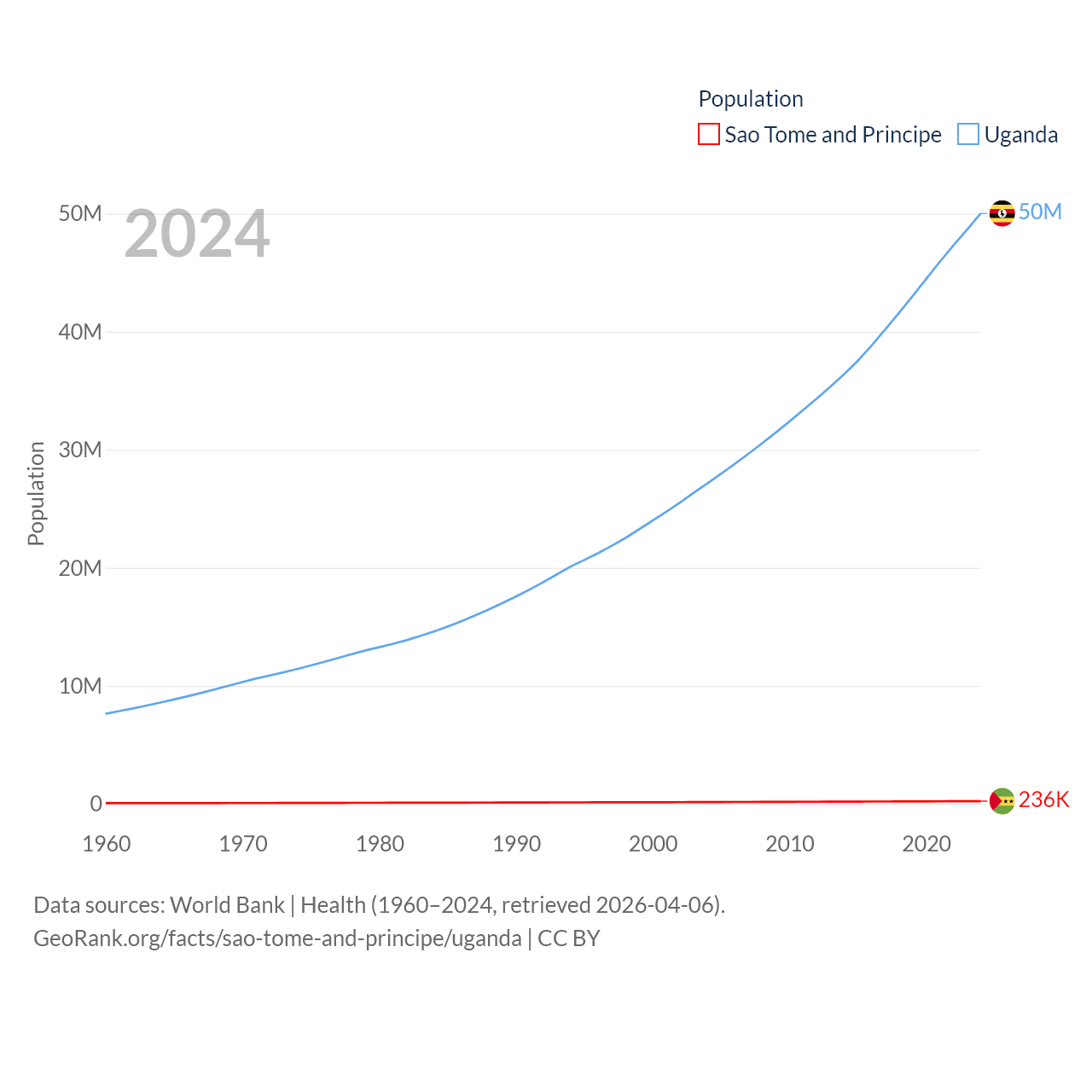 Sao Tome and Principe has a population of 236K (ranked 176/197), compared with 50M in Uganda (ranked 31/197). Sao Tome and Principe's land area is 371 sq mi versus 77,421 sq mi for Uganda (ranked 172nd vs. 84th).