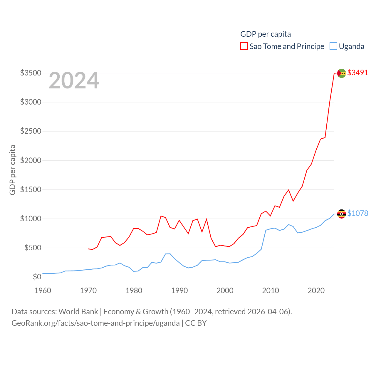 By GDP, Sao Tome and Principe ranks 189/197 ($822M) and Uganda ranks 89/197 ($53.9B). By GDP per capita, Sao Tome and Principe ranks 134/197 ($3,491), while Uganda ranks 176/197 ($1,078).