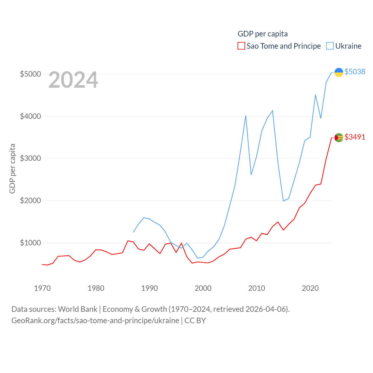 By GDP, Sao Tome and Principe ranks 189/197 ($822M) and Ukraine ranks 57/197 ($191B). By GDP per capita, Sao Tome and Principe ranks 134/197 ($3,491), while Ukraine ranks 120/197 ($5,038).