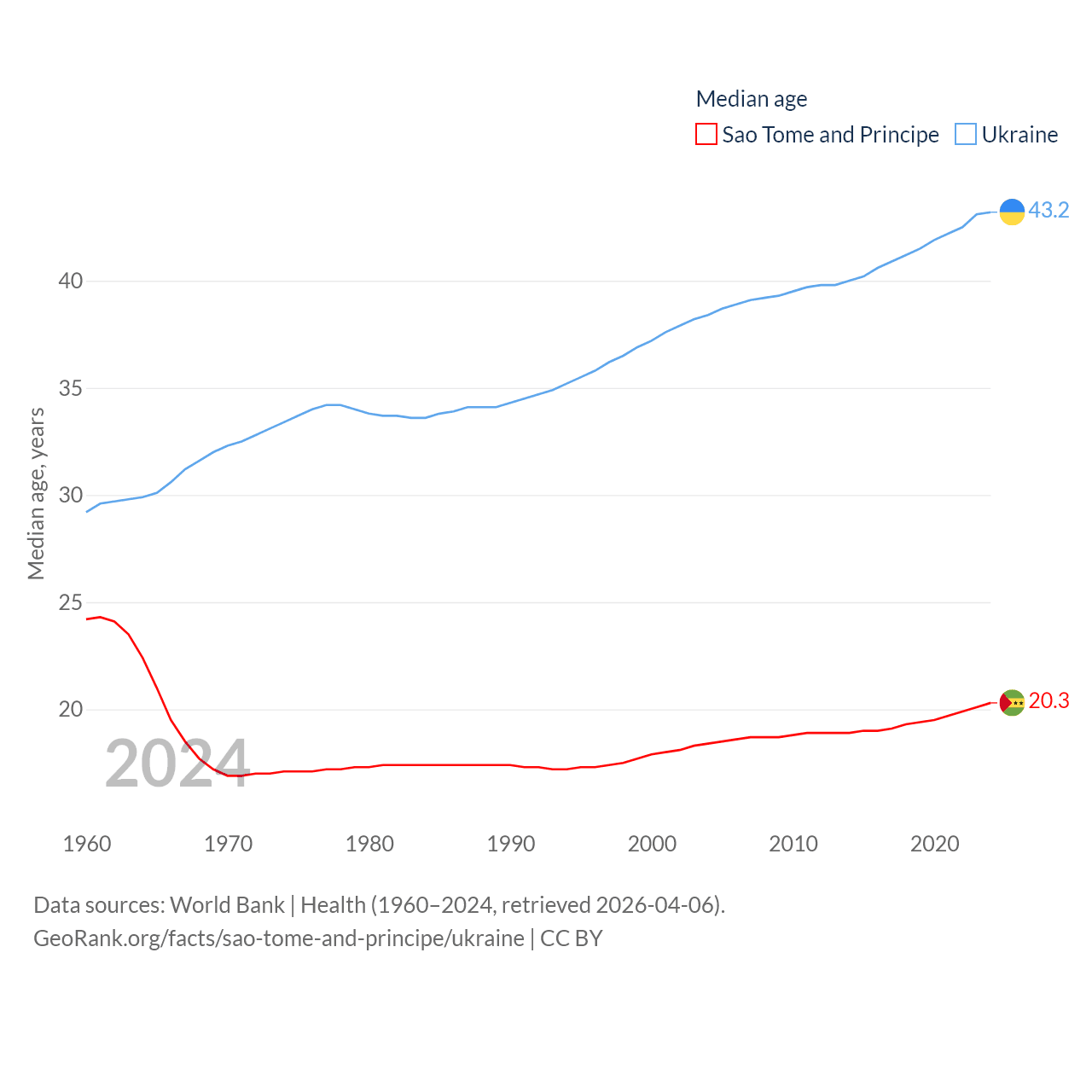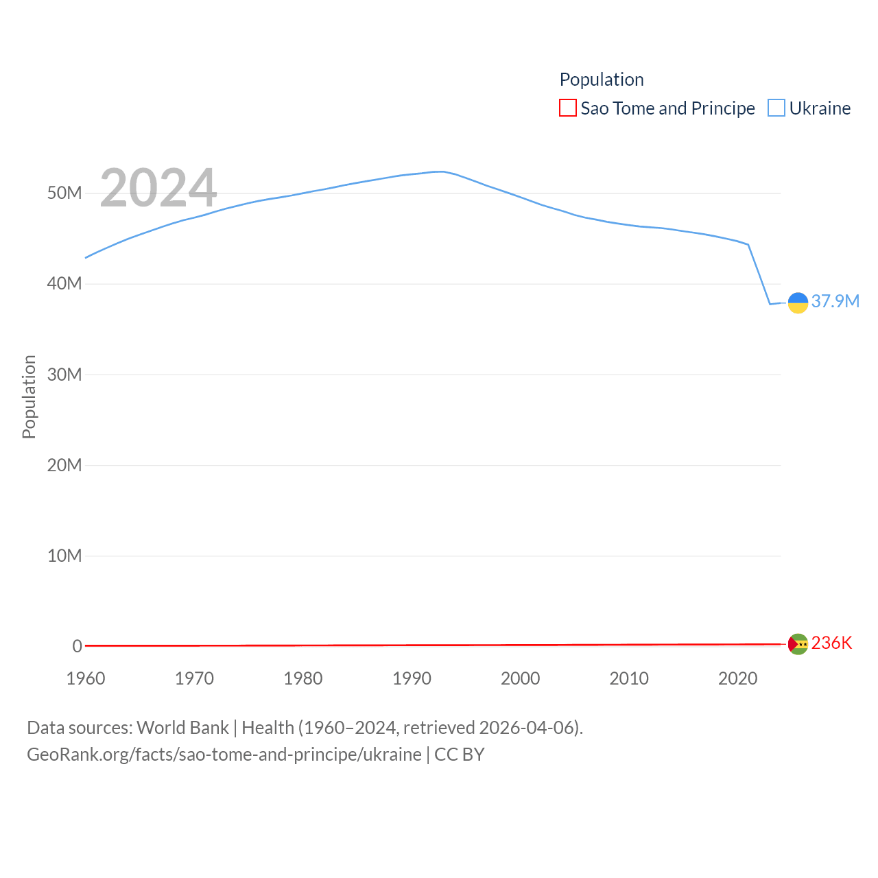 Sao Tome and Principe has a population of 236K (ranked 176/197), compared with 37.9M in Ukraine (ranked 41/197). Sao Tome and Principe's land area is 371 sq mi versus 223,708 sq mi for Ukraine (ranked 172nd vs. 46th).