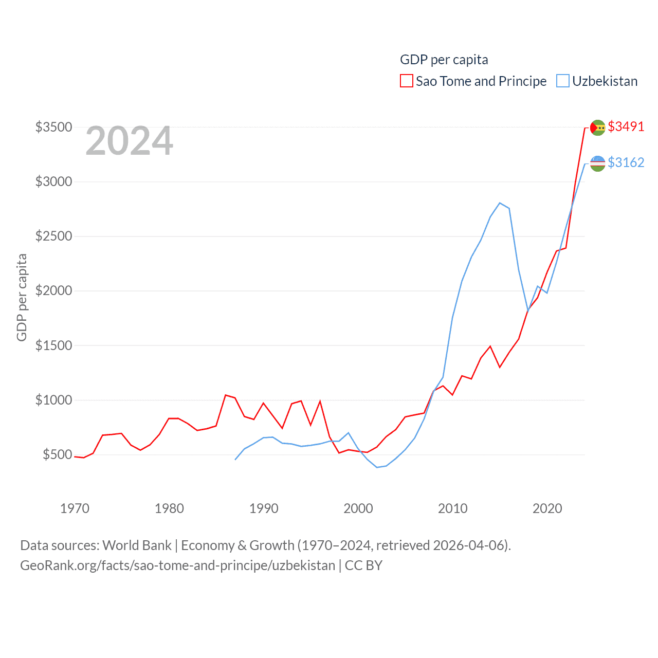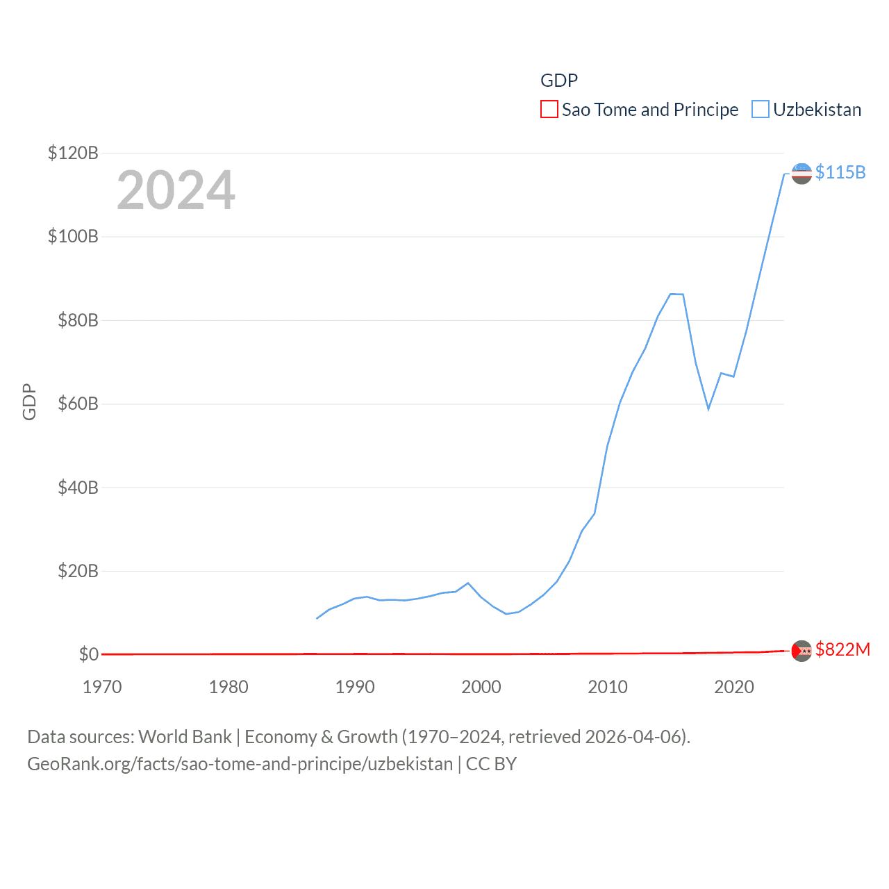 By GDP, Sao Tome and Principe ranks 189/197 ($822M) and Uzbekistan ranks 66/197 ($115B). By GDP per capita, Sao Tome and Principe ranks 134/197 ($3,491), while Uzbekistan ranks 139/197 ($3,162).
