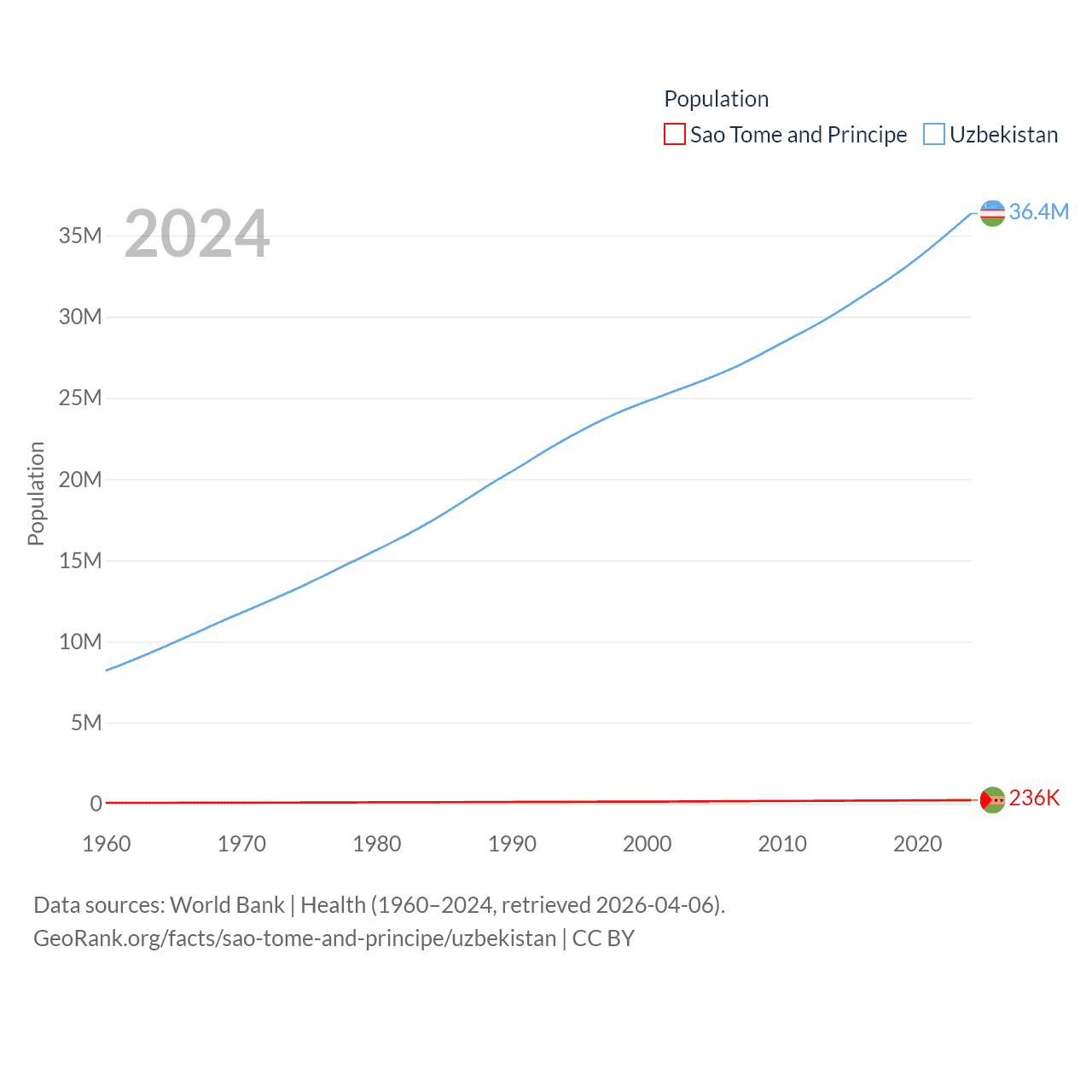 Sao Tome and Principe has a population of 236K (ranked 176/197), compared with 36.4M in Uzbekistan (ranked 43/197). Sao Tome and Principe's land area is 371 sq mi versus 170,136 sq mi for Uzbekistan (ranked 172nd vs. 56th).