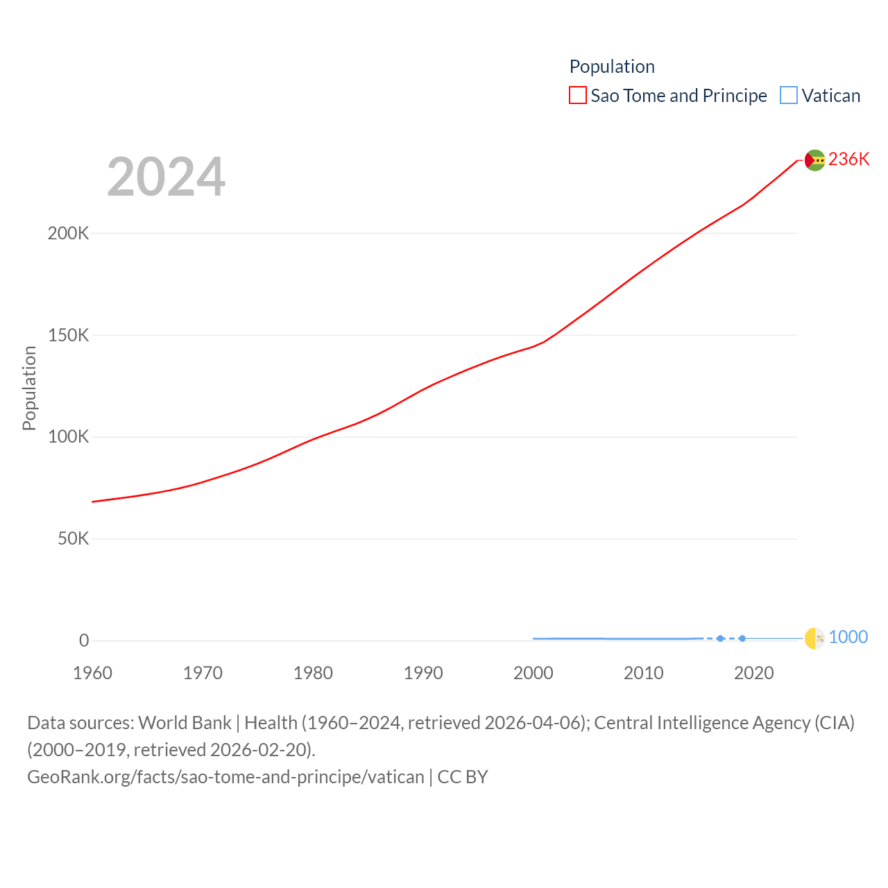 Sao Tome and Principe has a population of 236K (ranked 176/197), compared with 1K in The Vatican (ranked 197/197). Sao Tome and Principe's land area is 371 sq mi versus 0.17 sq mi for The Vatican (ranked 172nd vs. 197th).