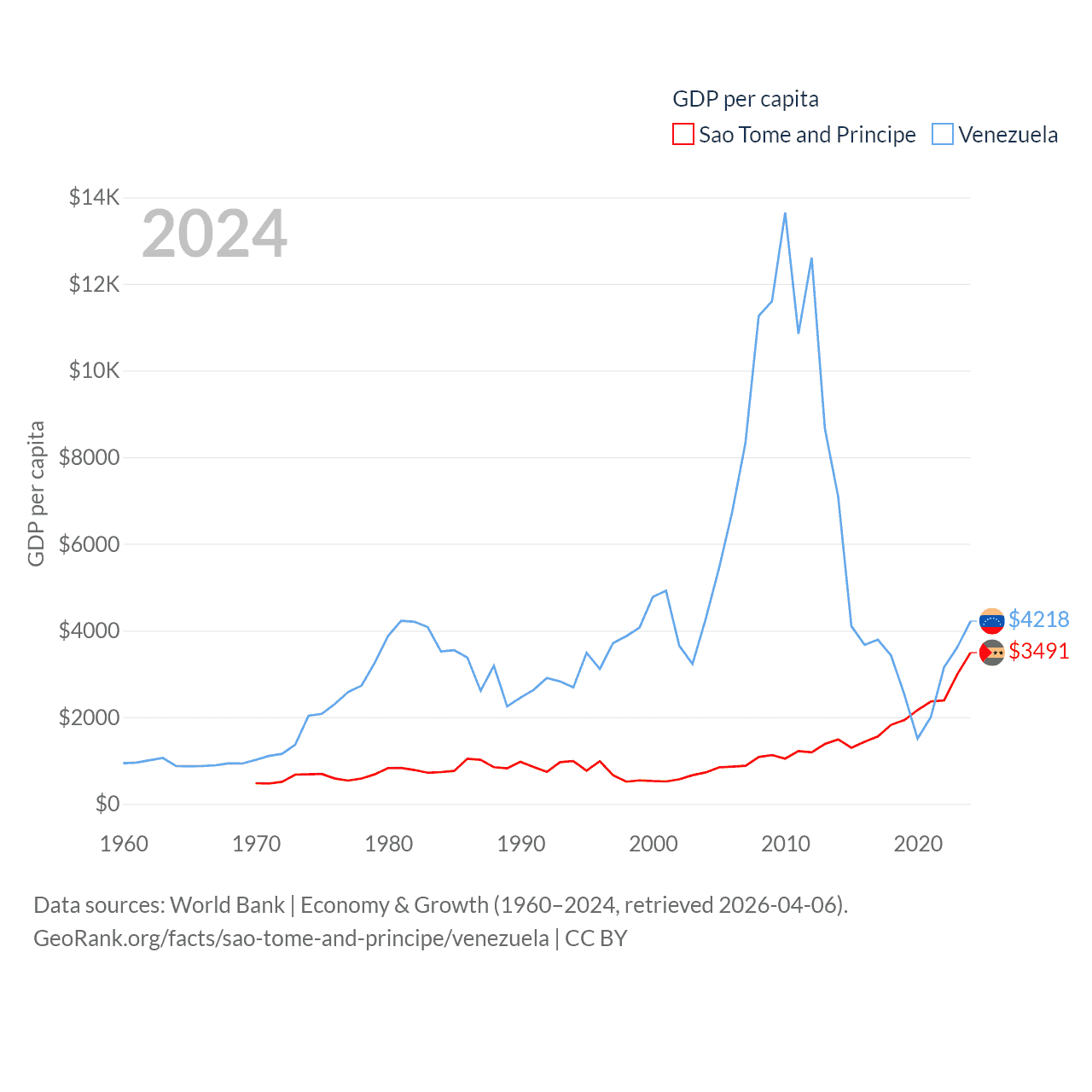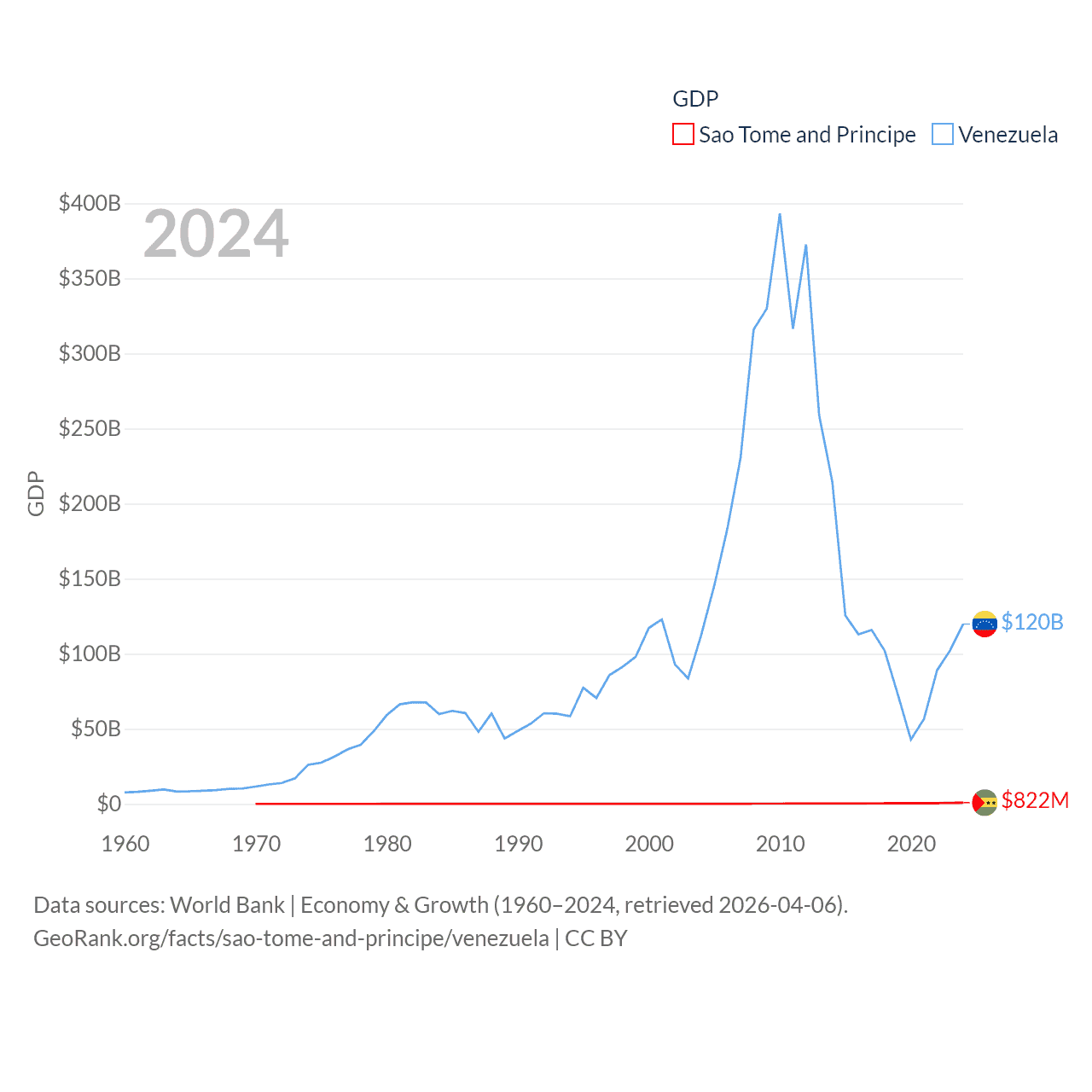 By GDP, Sao Tome and Principe ranks 189/197 ($822M) and Venezuela ranks 65/197 ($120B). By GDP per capita, Sao Tome and Principe ranks 134/197 ($3,491), while Venezuela ranks 128/197 ($4,218).