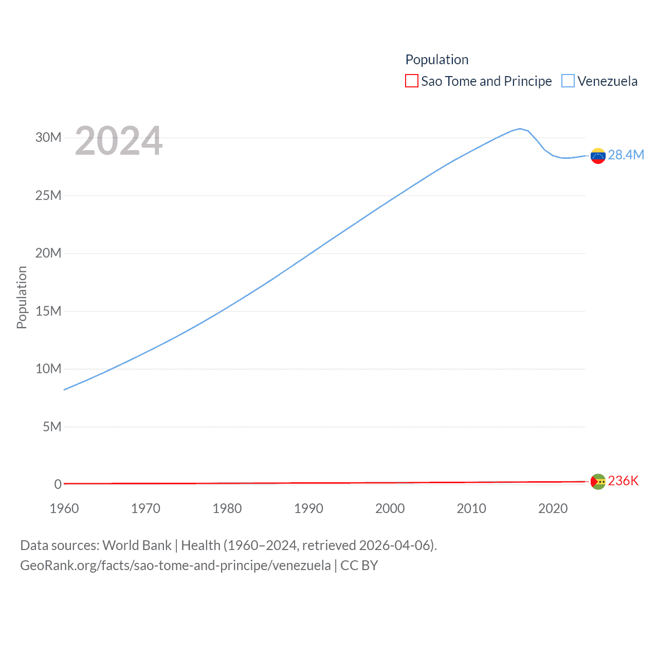 Sao Tome and Principe has a population of 236K (ranked 176/197), compared with 28.4M in Venezuela (ranked 53/197). Sao Tome and Principe's land area is 371 sq mi versus 340,561 sq mi for Venezuela (ranked 172nd vs. 32nd).