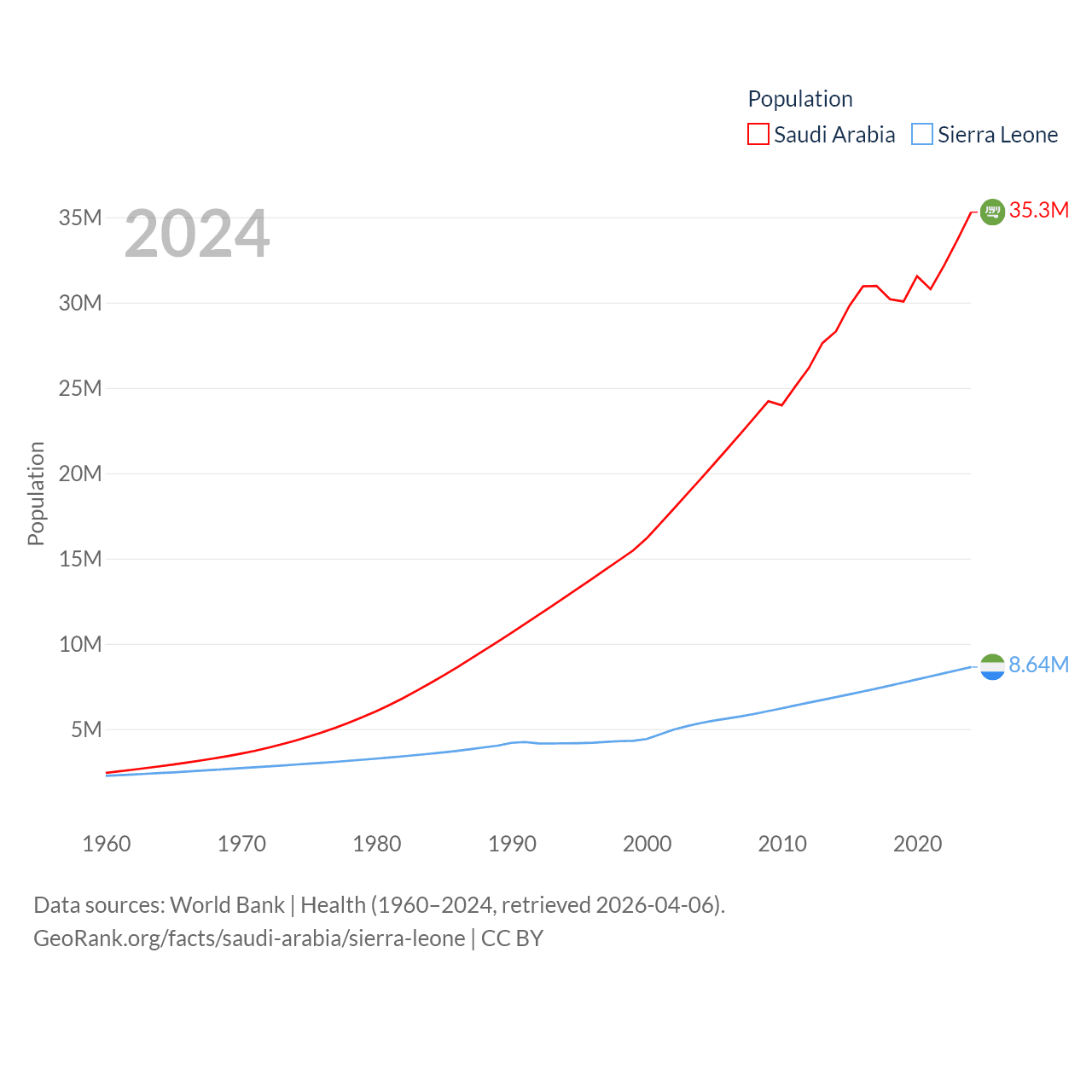 Saudi Arabia has a population of 35.3M (ranked 45/197), compared with 8.64M in Sierra Leone (ranked 102/197). Saudi Arabia's land area is 830,000 sq mi versus 27,869 sq mi for Sierra Leone (ranked 12th vs. 116th).