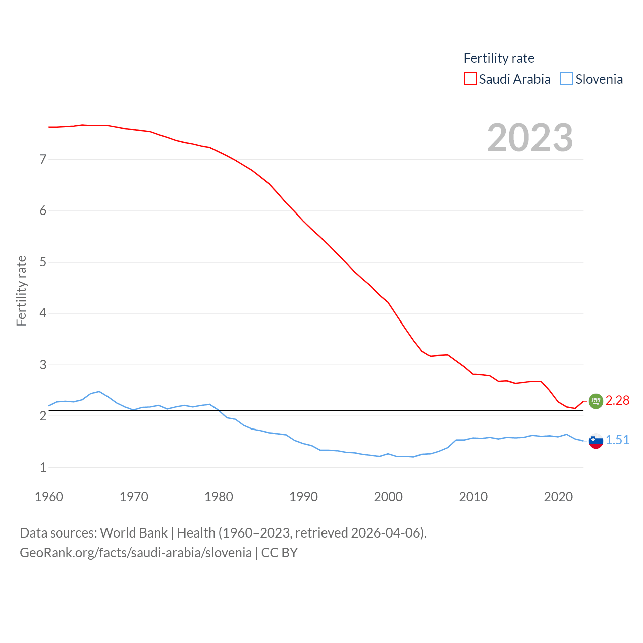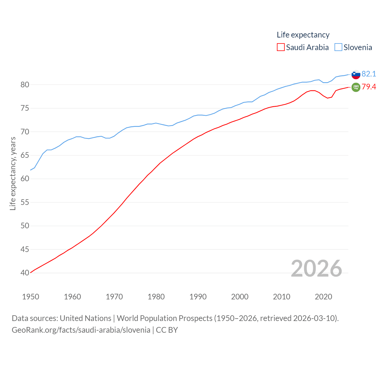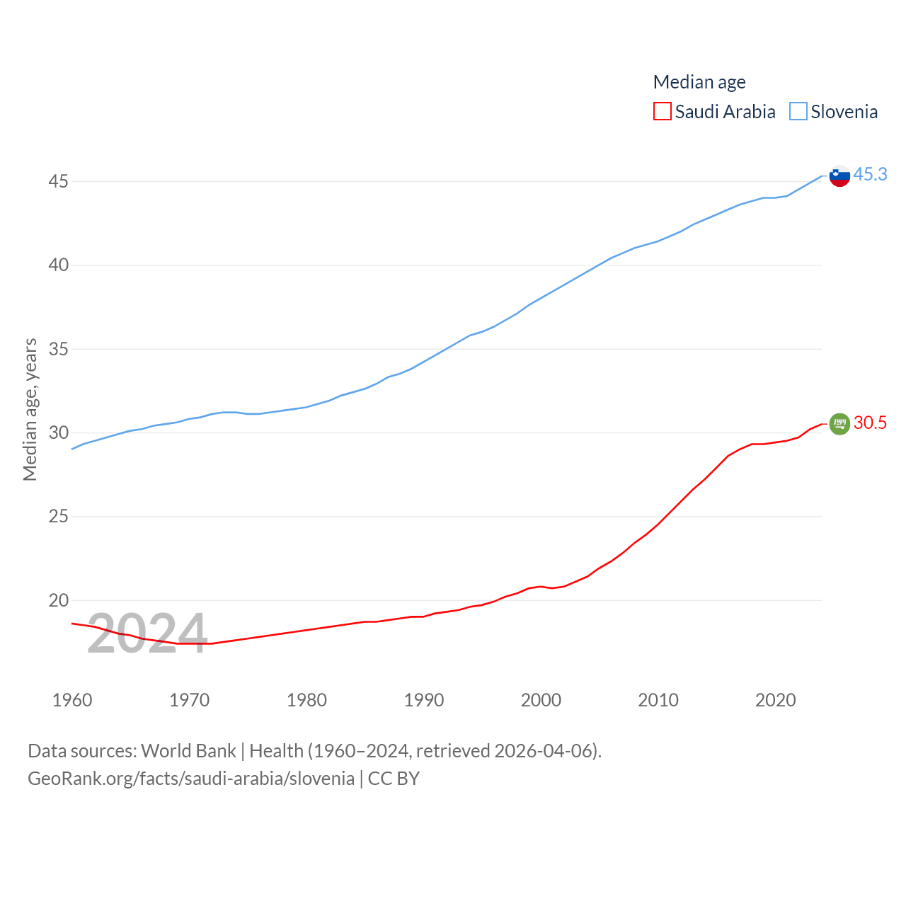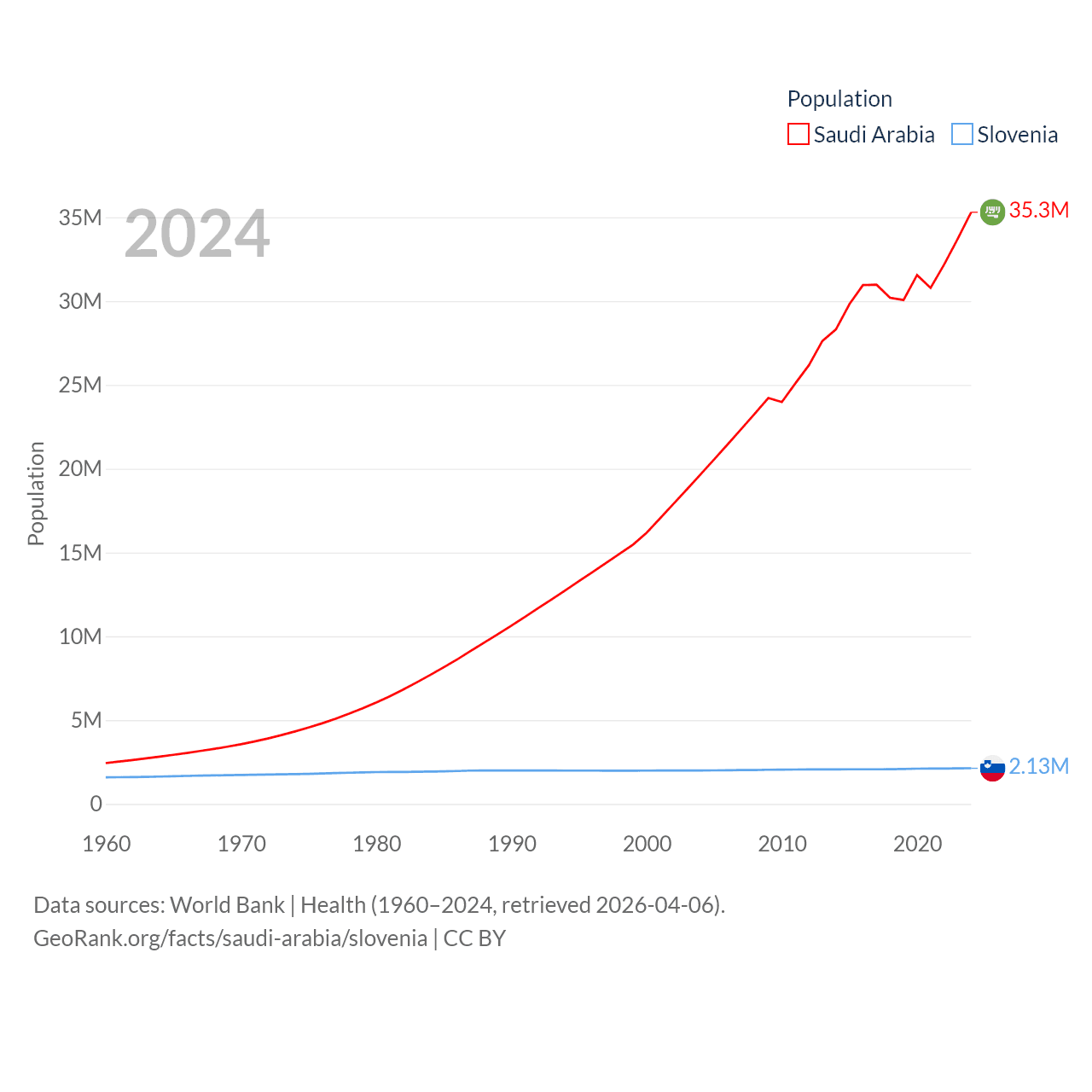 Saudi Arabia has a population of 35.3M (ranked 45/197), compared with 2.13M in Slovenia (ranked 147/197). Saudi Arabia's land area is 830,000 sq mi versus 7,774 sq mi for Slovenia (ranked 12th vs. 151st).