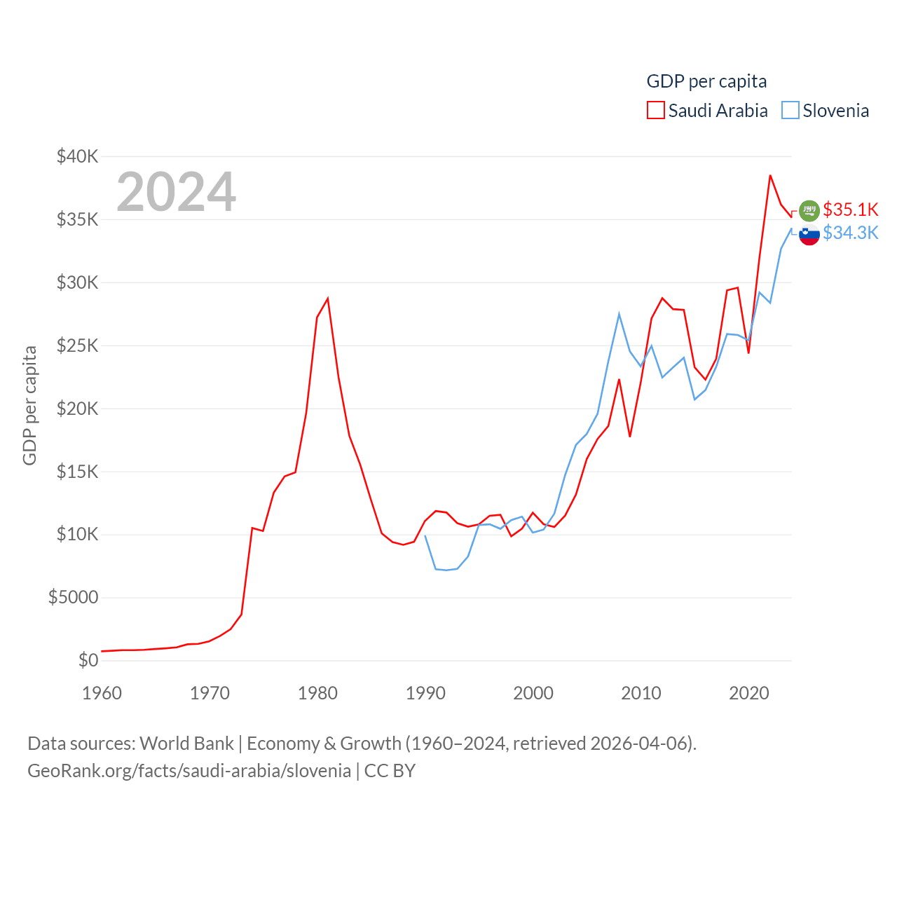 By GDP, Saudi Arabia ranks 18/197 ($1.24T) and Slovenia ranks 86/197 ($73B). By GDP per capita, Saudi Arabia ranks 33/197 ($35,122), while Slovenia ranks 34/197 ($34,301).