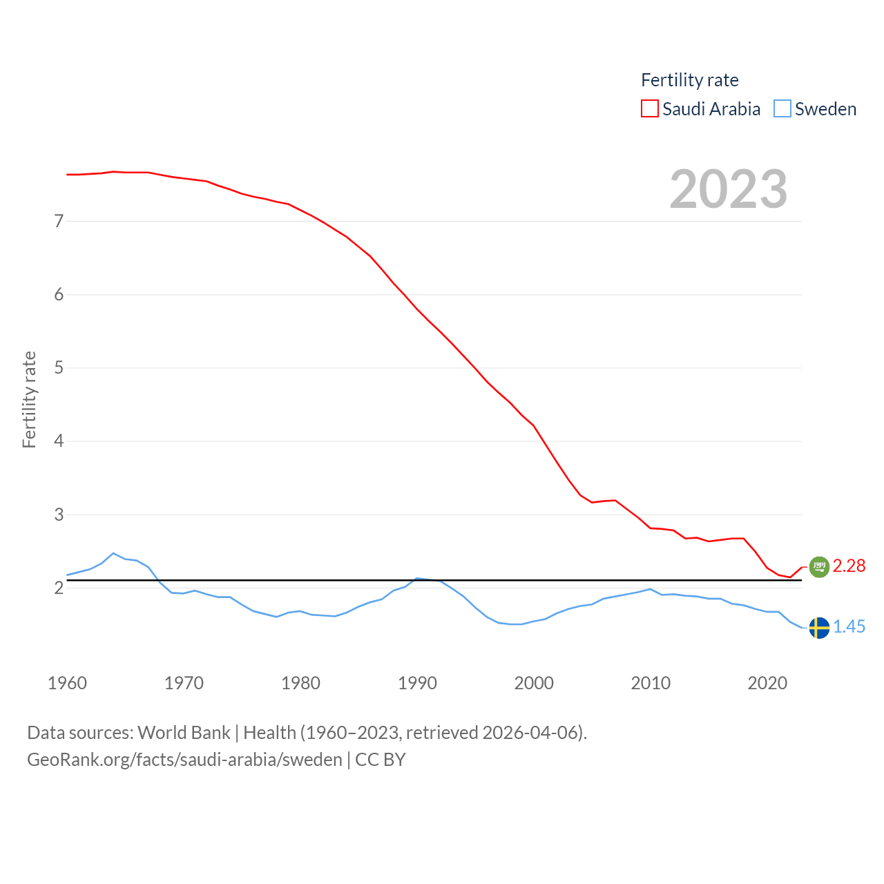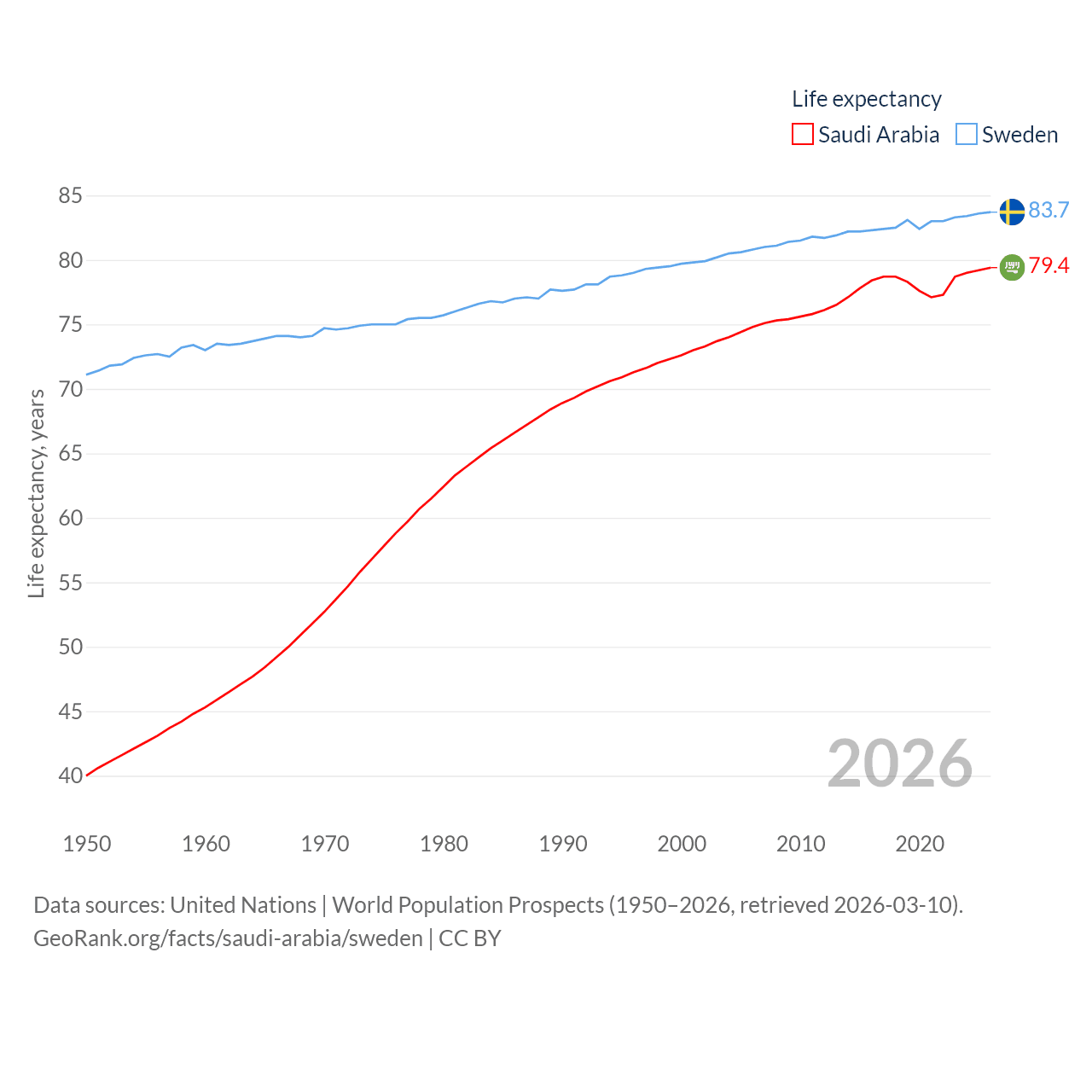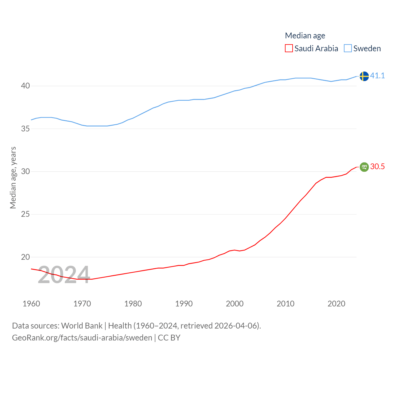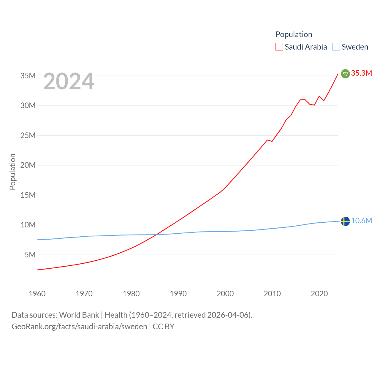 Saudi Arabia has a population of 35.3M (ranked 45/197), compared with 10.6M in Sweden (ranked 93/197). Saudi Arabia's land area is 830,000 sq mi versus 157,248 sq mi for Sweden (ranked 12th vs. 58th).