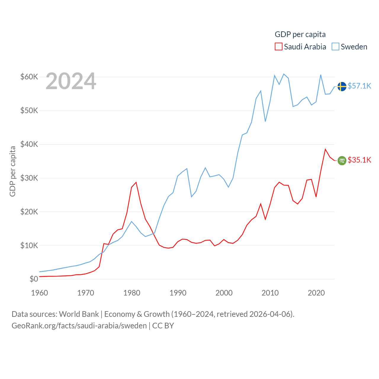 By GDP, Saudi Arabia ranks 18/197 ($1.24T) and Sweden ranks 26/197 ($604B). By GDP per capita, Saudi Arabia ranks 33/197 ($35,122), while Sweden ranks 17/197 ($57,117).
