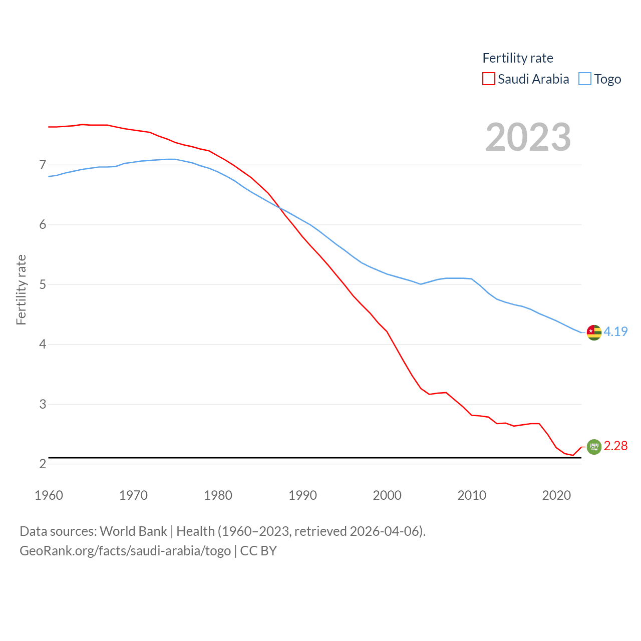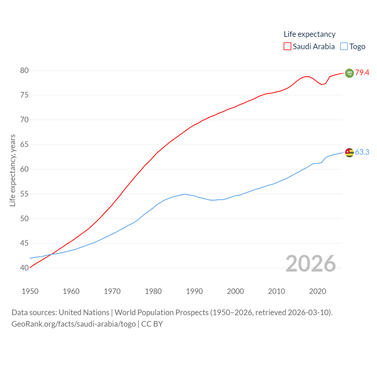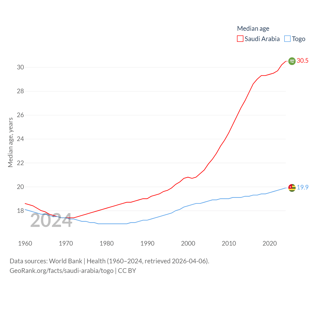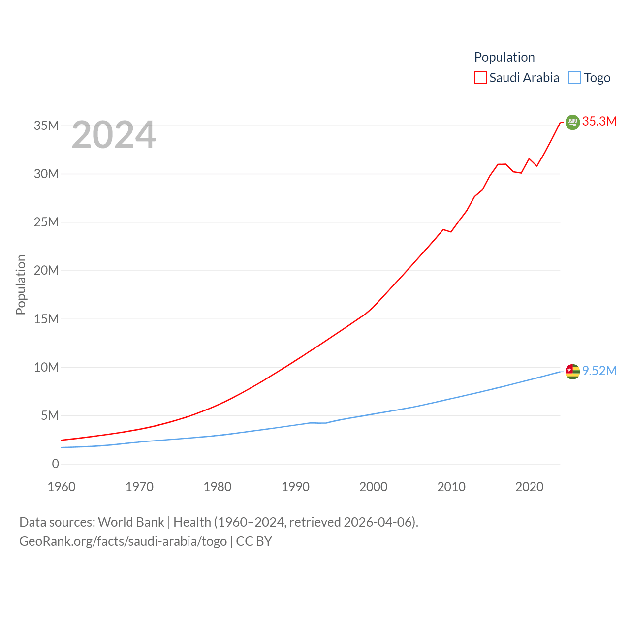 Saudi Arabia has a population of 35.3M (ranked 45/197), compared with 9.52M in Togo (ranked 98/197). Saudi Arabia's land area is 830,000 sq mi versus 21,000 sq mi for Togo (ranked 12th vs. 124th).